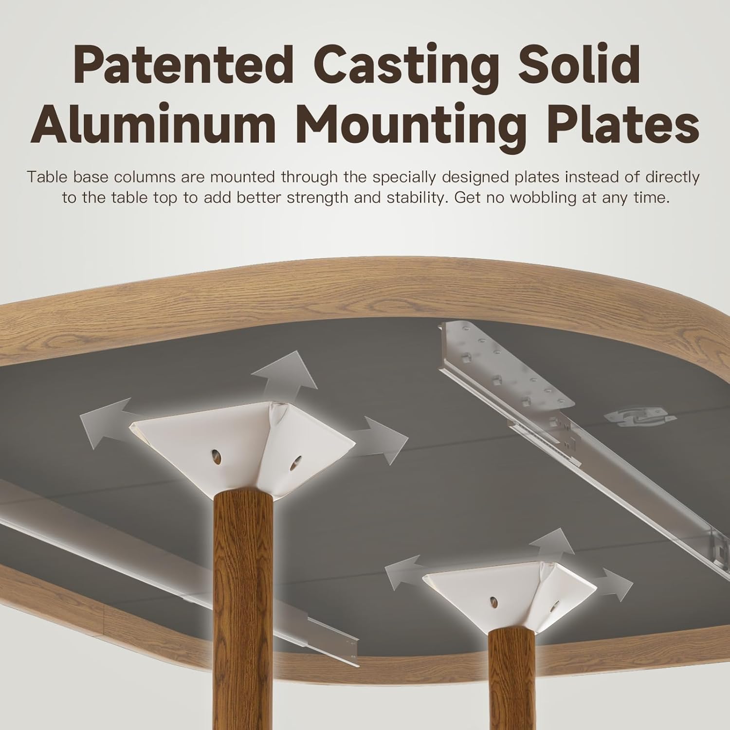 Patented Mounting PlateThe table features exclusive design patented mounting plates installed on the underside, allowing the table base to be attached to the underside High Pressure Laminate via the mounting plate instead of directly mounting under the table panel. This design prevents damage to the solid wood panel of the table and ensuring its integrity.