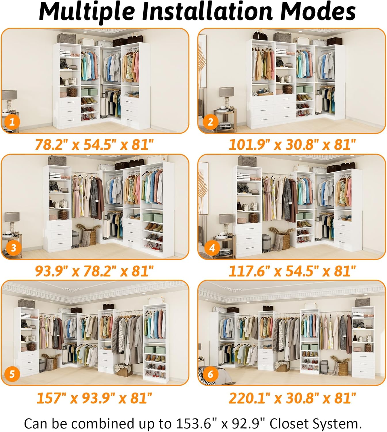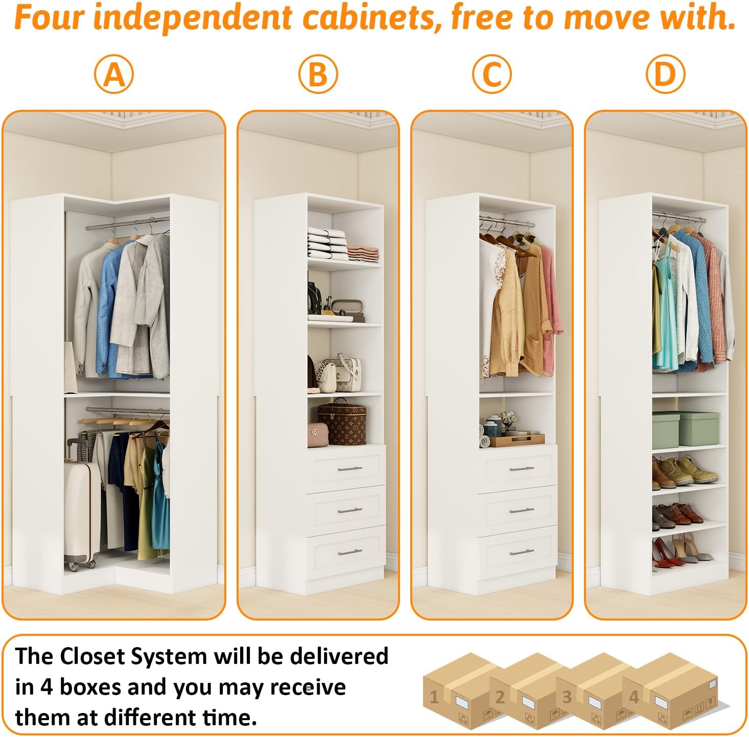 - 4PCSstanding modular closet system - 1pcs corner closet systerm + 3 other different styles closet systems.