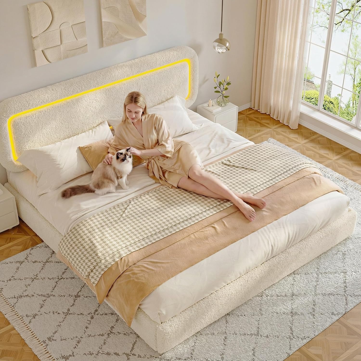 Smart Ring LED LightsSwitch from bright white for reading to warm amber for relaxing via remote or app. The unique ring light band of the king size bed frame complements the cloud-like boucle headboard, blending modern tech with soft texture to create a functional and stylish atmosphere