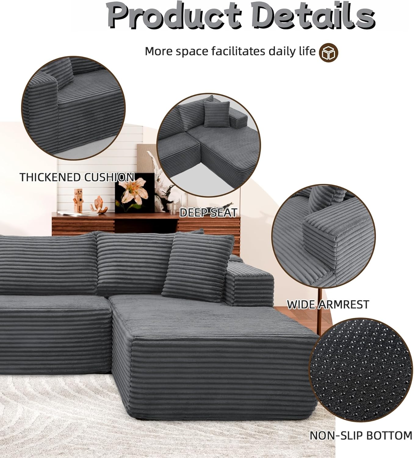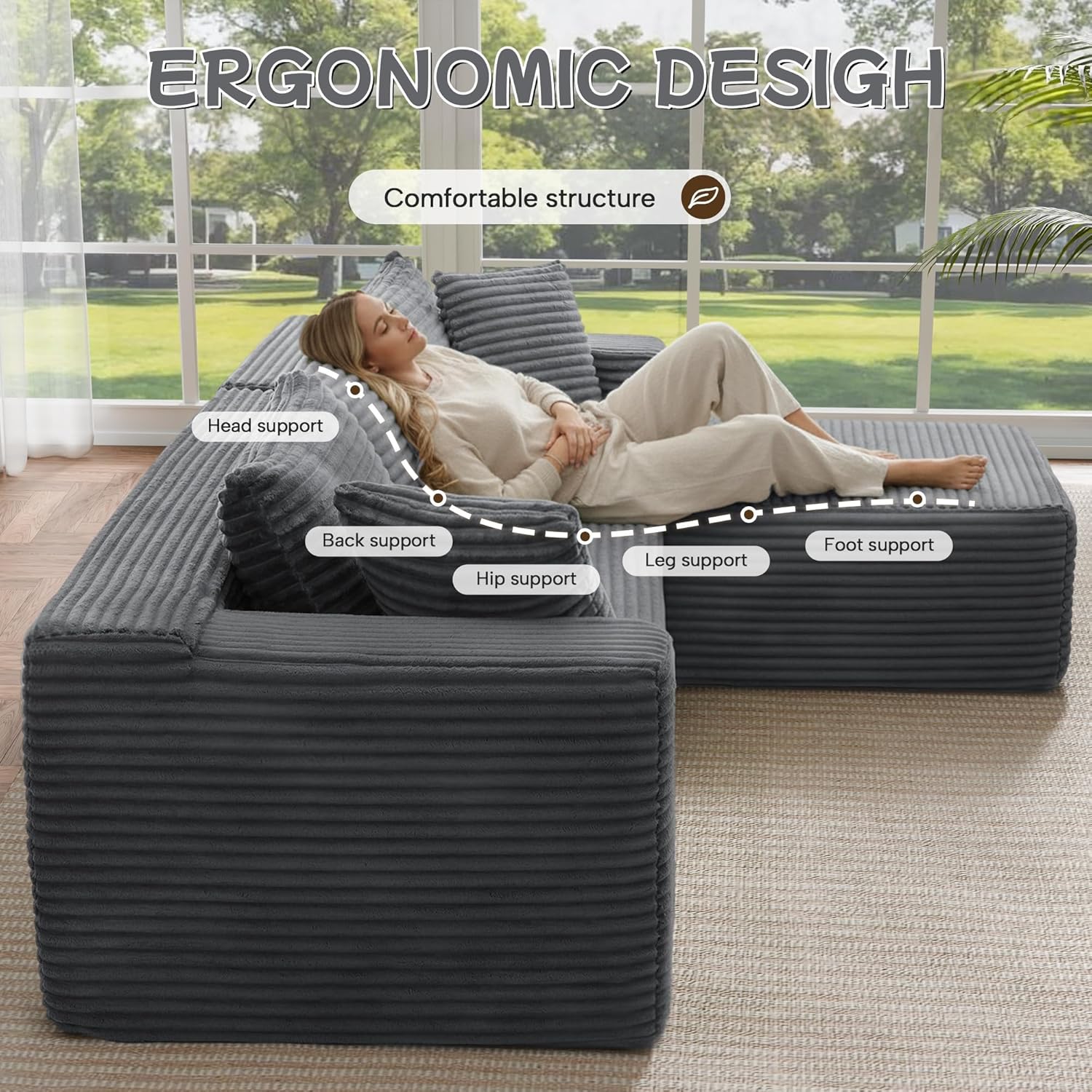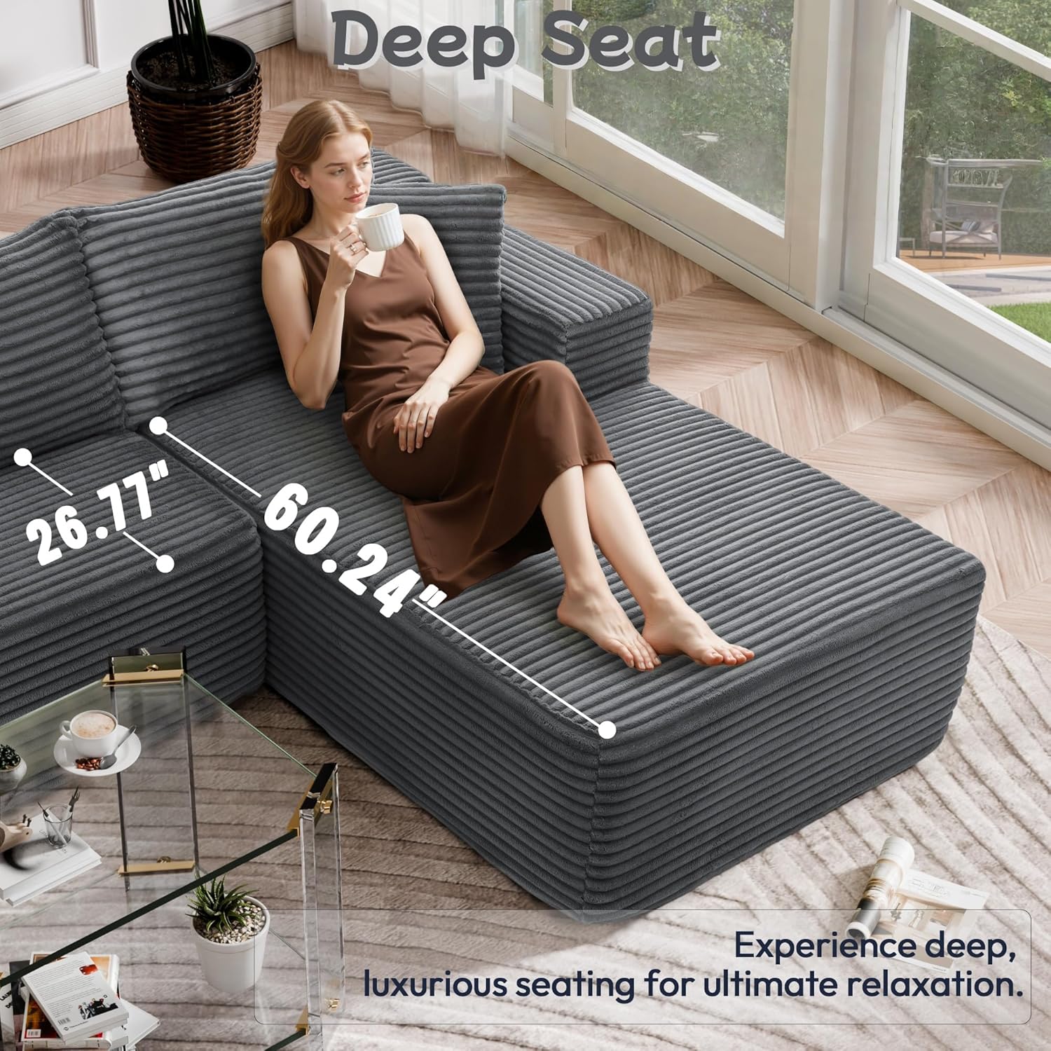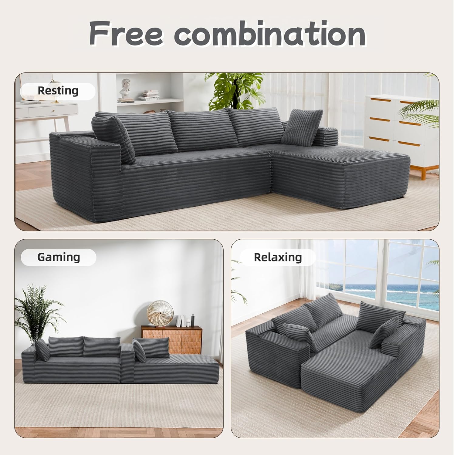 Spacious Space: This Cloud Sectional Couch has a total length of 105.51 inches and comes with a spacious back chair. Our interchangeable sofa collection embodies a spacious, cloud-like seating experience, allowing you to indulge in unparalleled luxury.