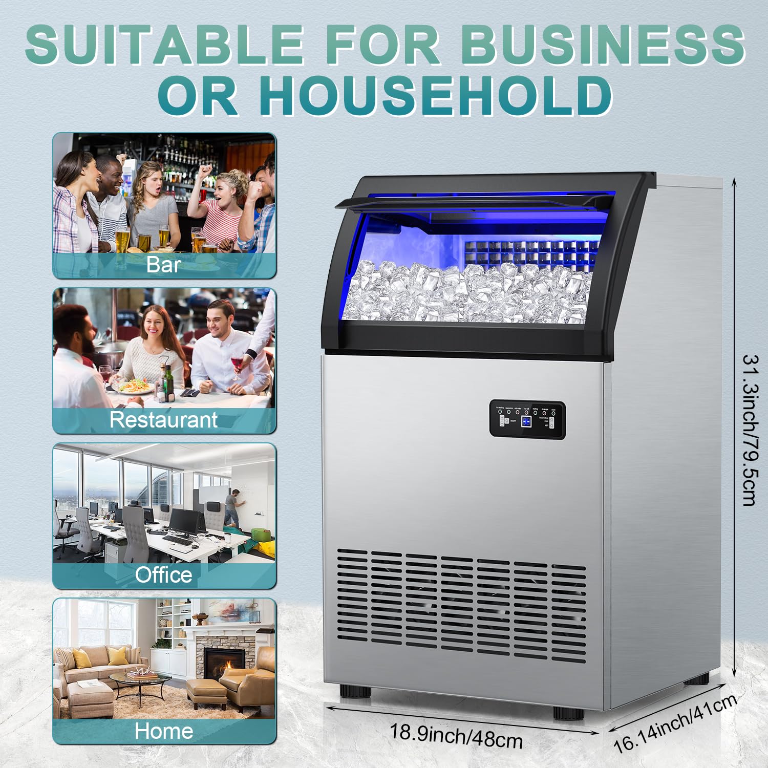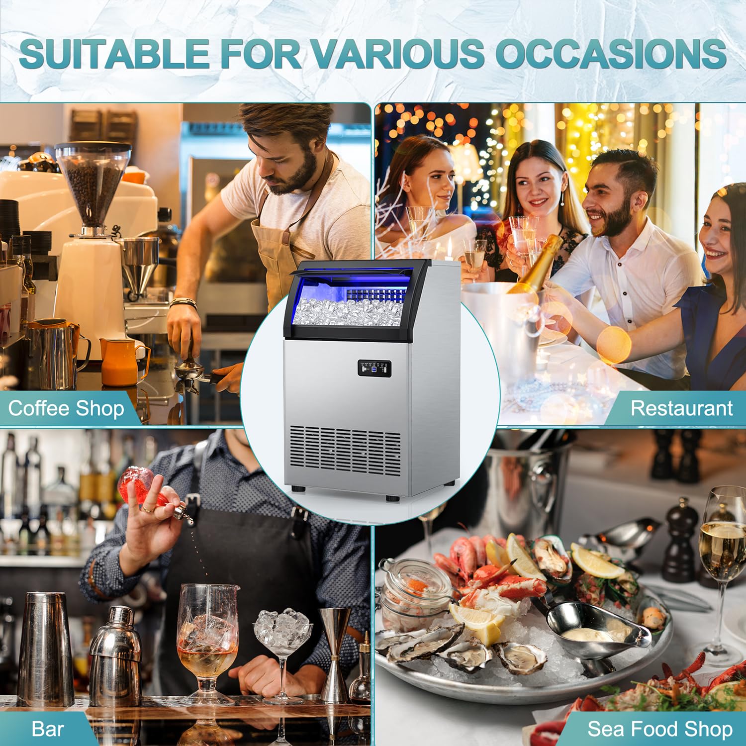 FLEXIBLE INSTALLATION: This undercounter ice maker machine commercial supports multiple installation methods, including freestanding, built-in, or undercounter setups, making it easy to fit into various small to medium-sized commercial environments. Its ideal for use in kitchens, bars, cafs, restaurants, and other business settings.