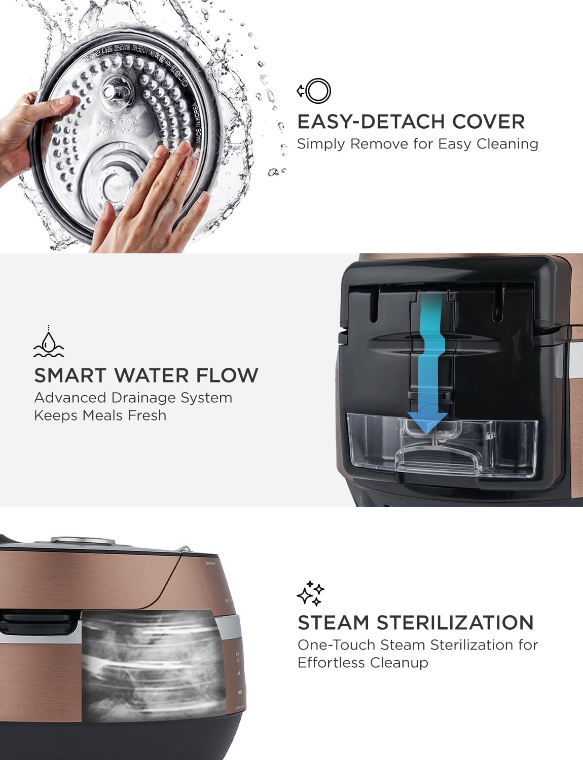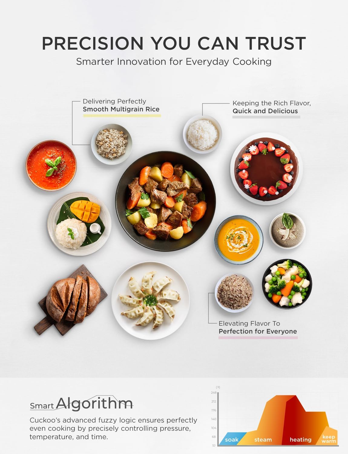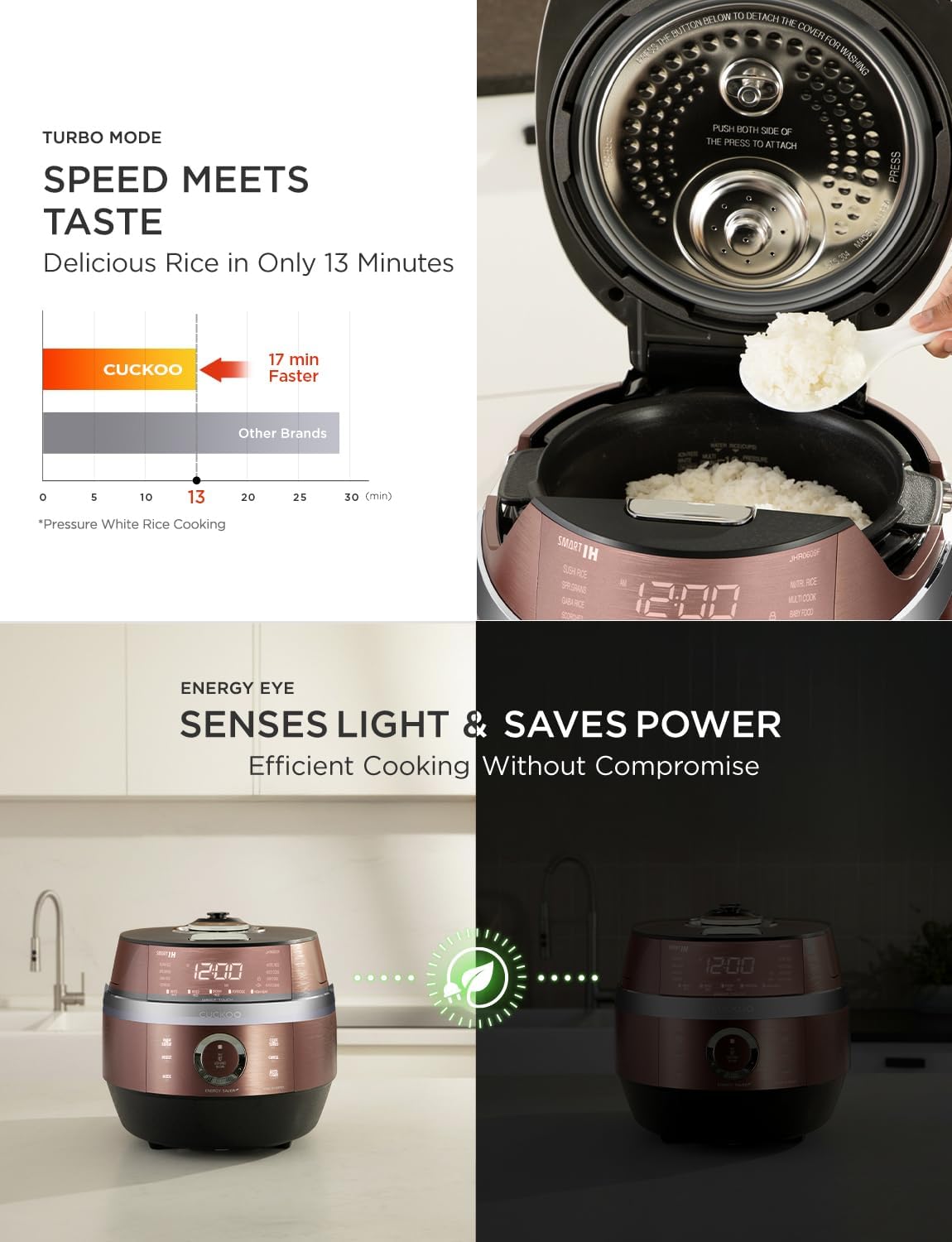 Experiment to your Heart's Desire with 's CRP-JHR0609F 6-Cup Induction Heating Pressure Rice Cooker! Consistently delicious rice, optimally reheated leftovers, ready-made meals with the press of a button, and professional grade quality - with 's CRP-JHR0609F 6-Cup Induction Heating Pressure Rice Cooker, all of this and more will be at your disposal. Key Features: Multi-Functional Cooking: This multi-functional cooker has 16 fully customizable menu options that allow a wide variety of meals, a reheat option for leftovers, and a keep-warm function to ensure none of your food is ever overcooked or burnt while serving. Smart Automated Technology: Included with an LED screen complete with touch controls and Fuzzy Logic technology, the cooker will immediately detect and adjust its temperature accordingly. 3 Language Voice Guide: Includes a voice navigation guide in English, Chinese, and Korean, this rice cooker will act as your personal kitchen assistant! High-Quality Construction: Featuring a 304 food-grade stainless steel inner pot with a nonstick coating that ensures optimal temperature and heat distribution throughout the cooking process. Hassle-Free Cleaning: For easy cleaning, the unit features a removable stainless steel inner lid, ensuring your rice maintains its great taste with every use. Elevate your culinary experience with 's CRP-JHR0609F 6-Cup Induction Heating Pressure Rice Cooker, where innovation meets gourmet excellence!