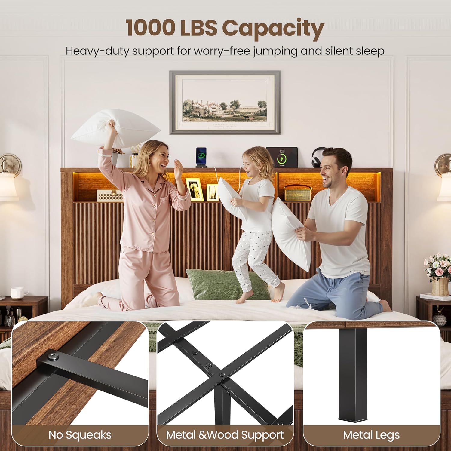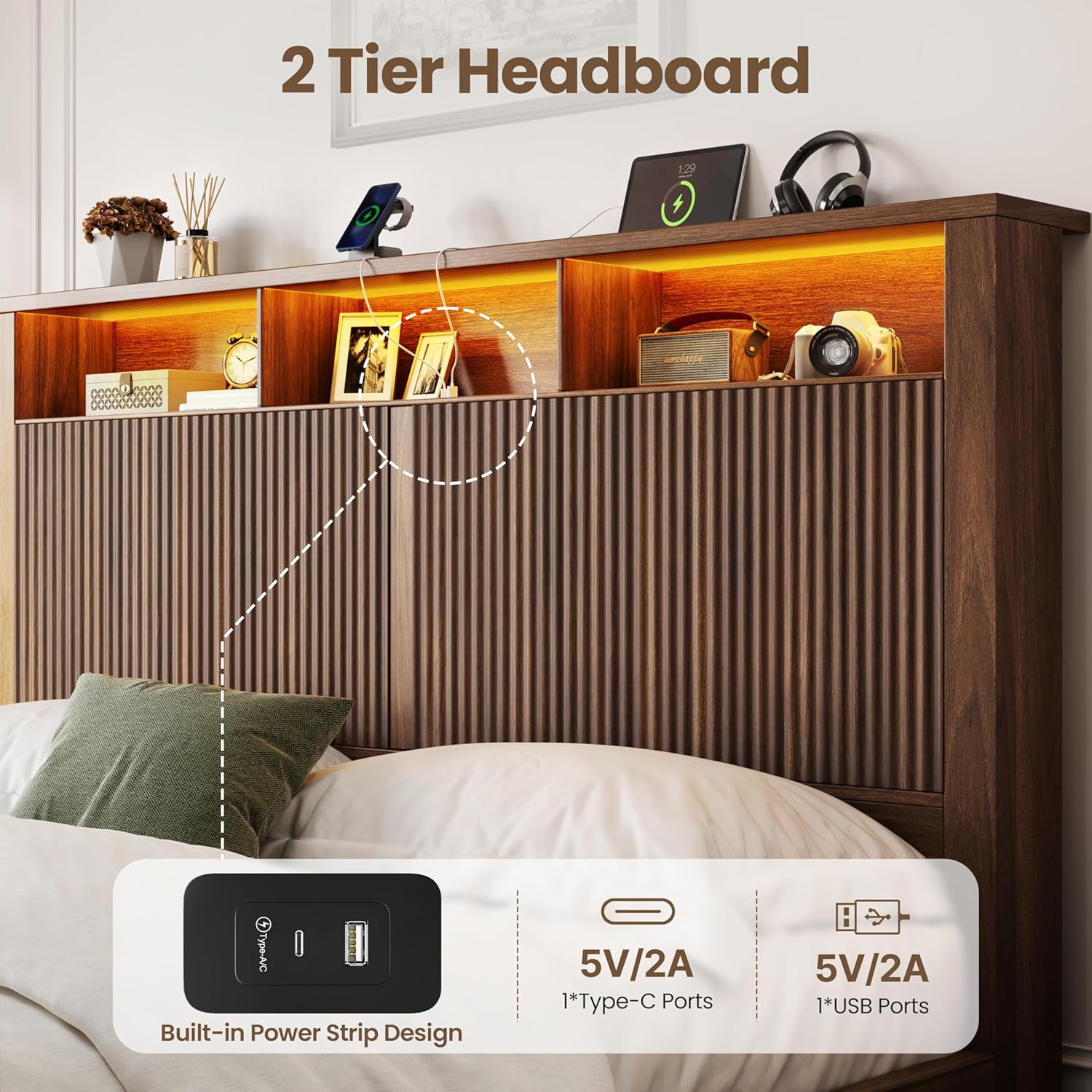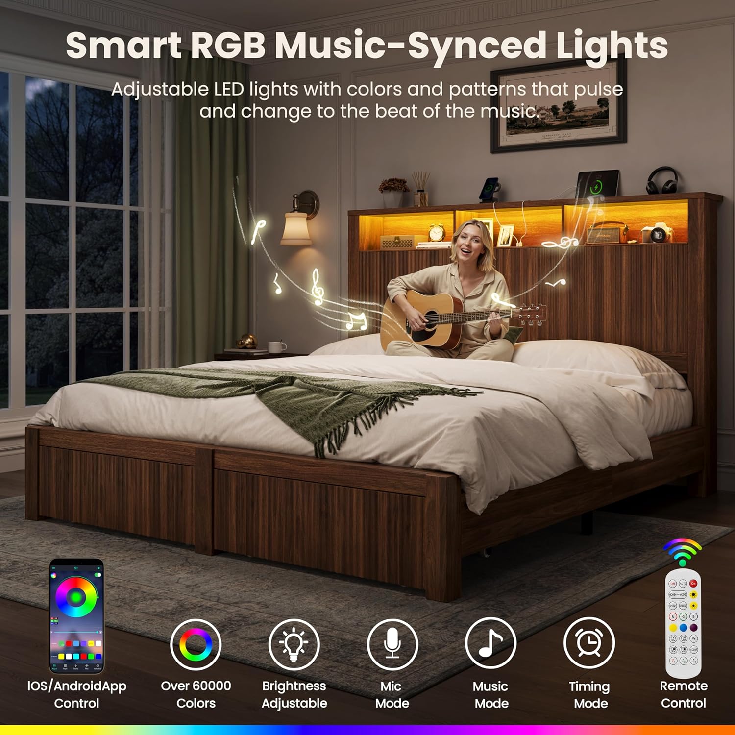 High Headboard with LED Strip Lights & Charging StationThis Queen bed frame with headboard features an elegant wave-patterned design. The headboard incorporates built-in RGB LED strip lights controllable via remote or mobile app, offering 5 modes to elevate your bedroom ambiance. The storage-equipped Queen size bed frame includes 2 power outlets for convenient device charging. Create a vibrant modern bedroom blending functionality and atmosphere.