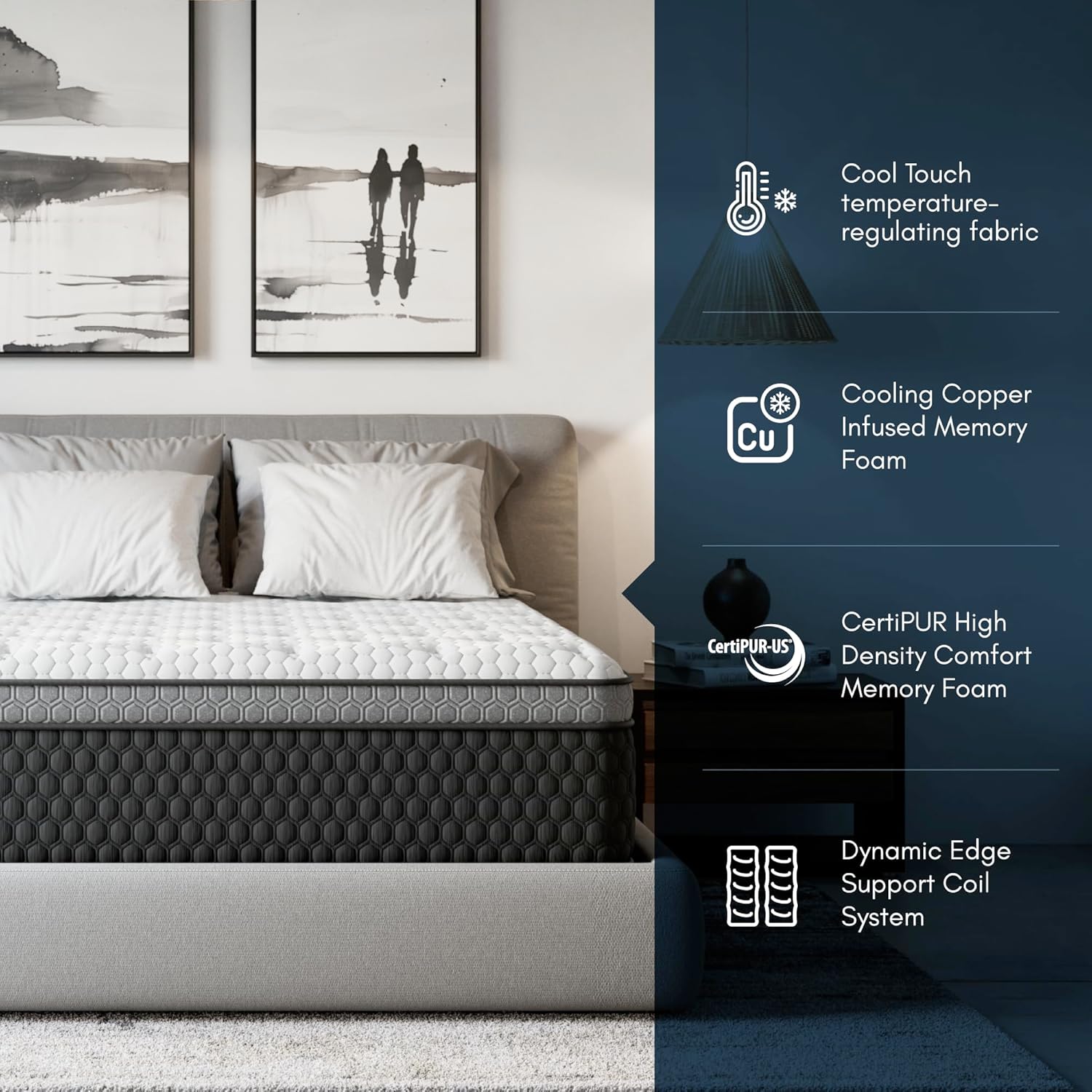 COPPERINFUSED MEMORY FOAM Naturally conductive copper draws excess body heat away and provides temperaturebalanced sleep surface.