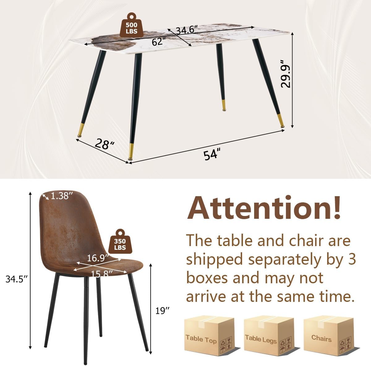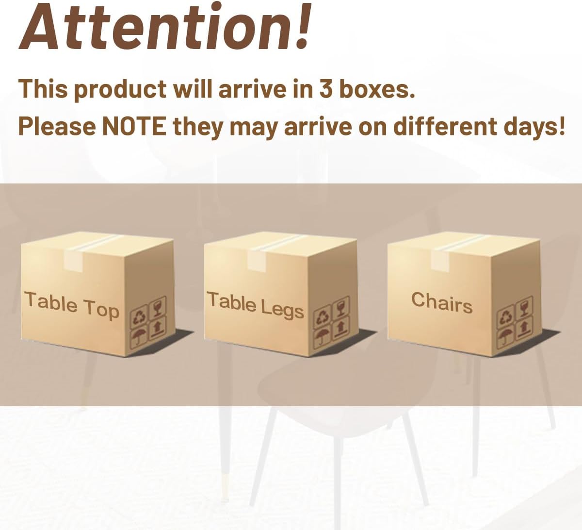 Table (2 packages), Chairs (1 packages). If you only receive 1 of the boxes, please don't worry as the others will arrive soon.