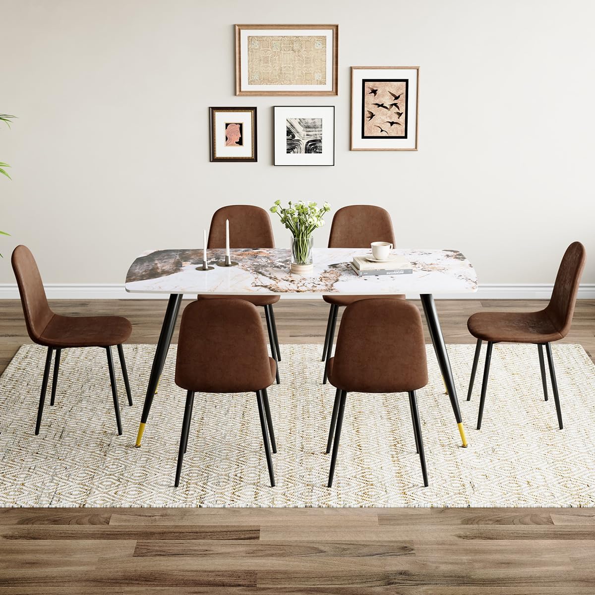 Contemporary Design: The set features 6 modern chairs that seamlessly integrate with the overall aesthetic of the dining table. With clean lines and a minimalist design, these chairs add a touch of sophistication to your kitchen or dining room while providing comfortable seating for your guests.