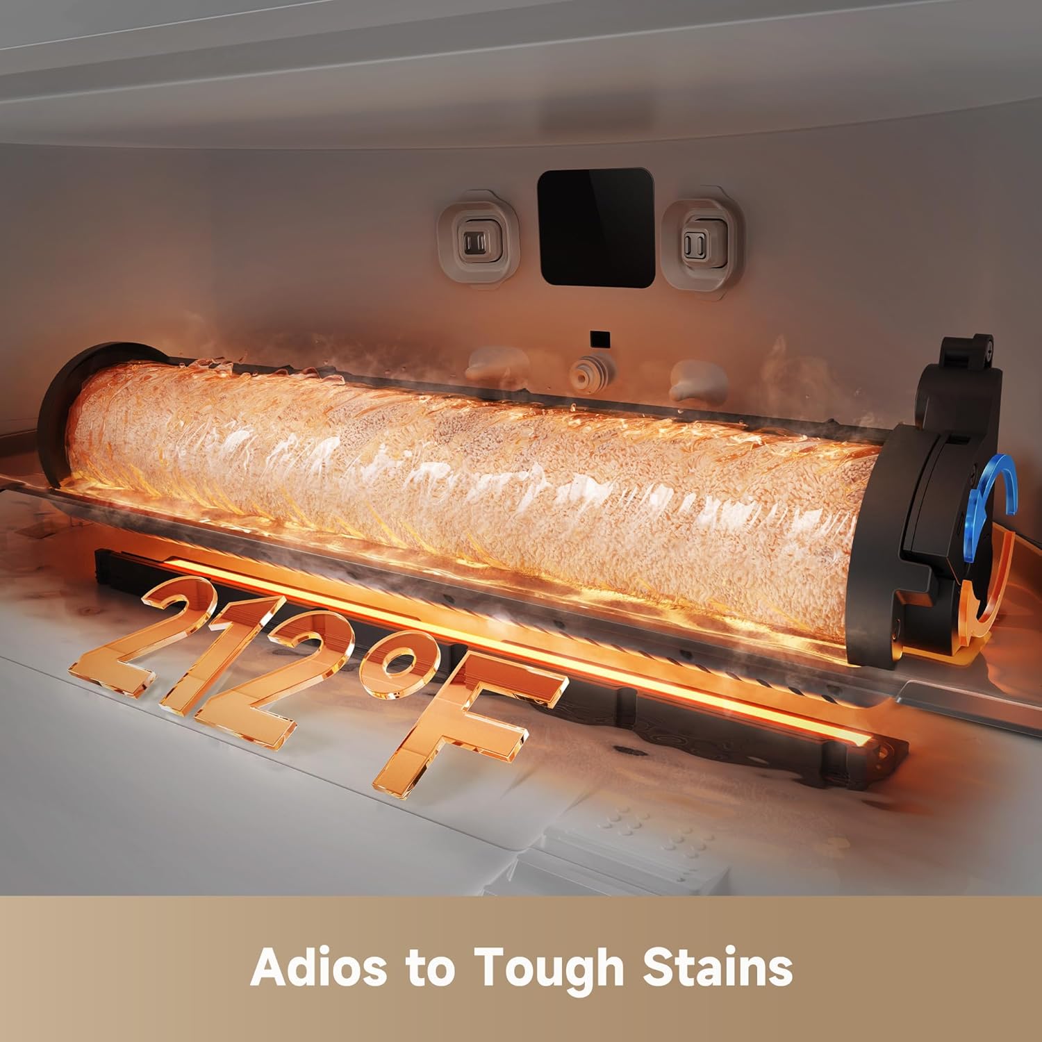 A Heated Self-Care Routine: The 212F ThermoHub roller self-cleaning system intelligently washes the roller mopall while you relax.