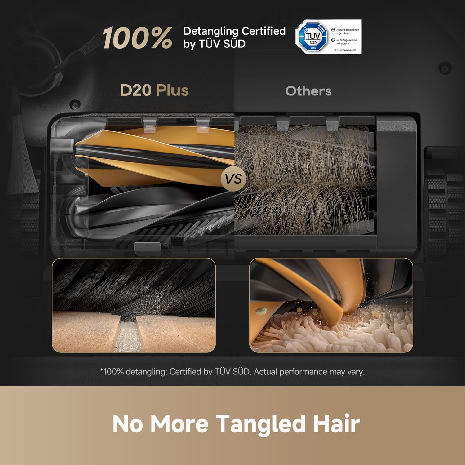 13,000Pa Suction + DuoBrush Say Bye to Tangled Hair D20 Plus comes with 13,000Pa Vormax suction (yeah, thats super strong), and its anti-tangle DuoBrush grabs long hair and pet fur like a prono more messy rollers to clean.