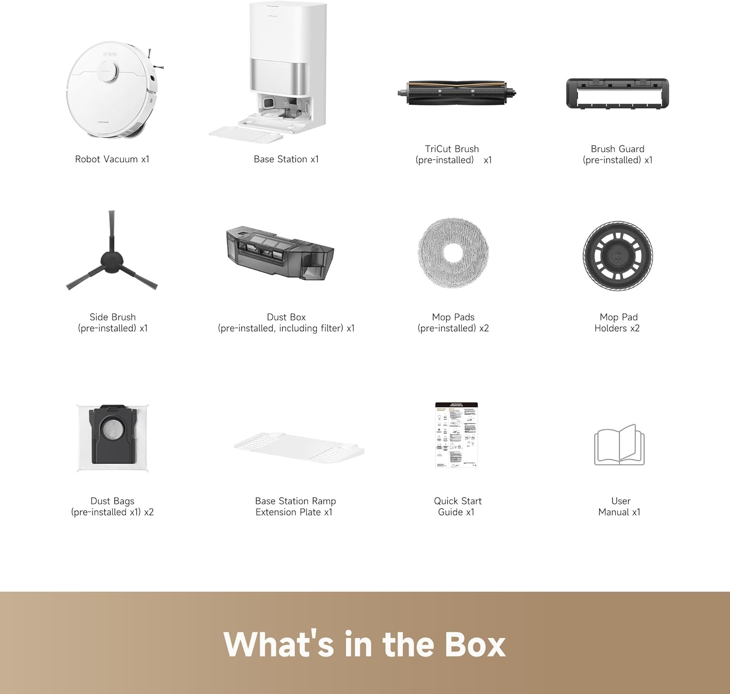 Tangle-Free Hair Removal with Specialized Brush: Designed with an innovative TriCut Brush, this robot vacuum and mop combo efficiently collects and cuts through long hairs, preventing tangles and ensuring smooth operation with minimal manual intervention.