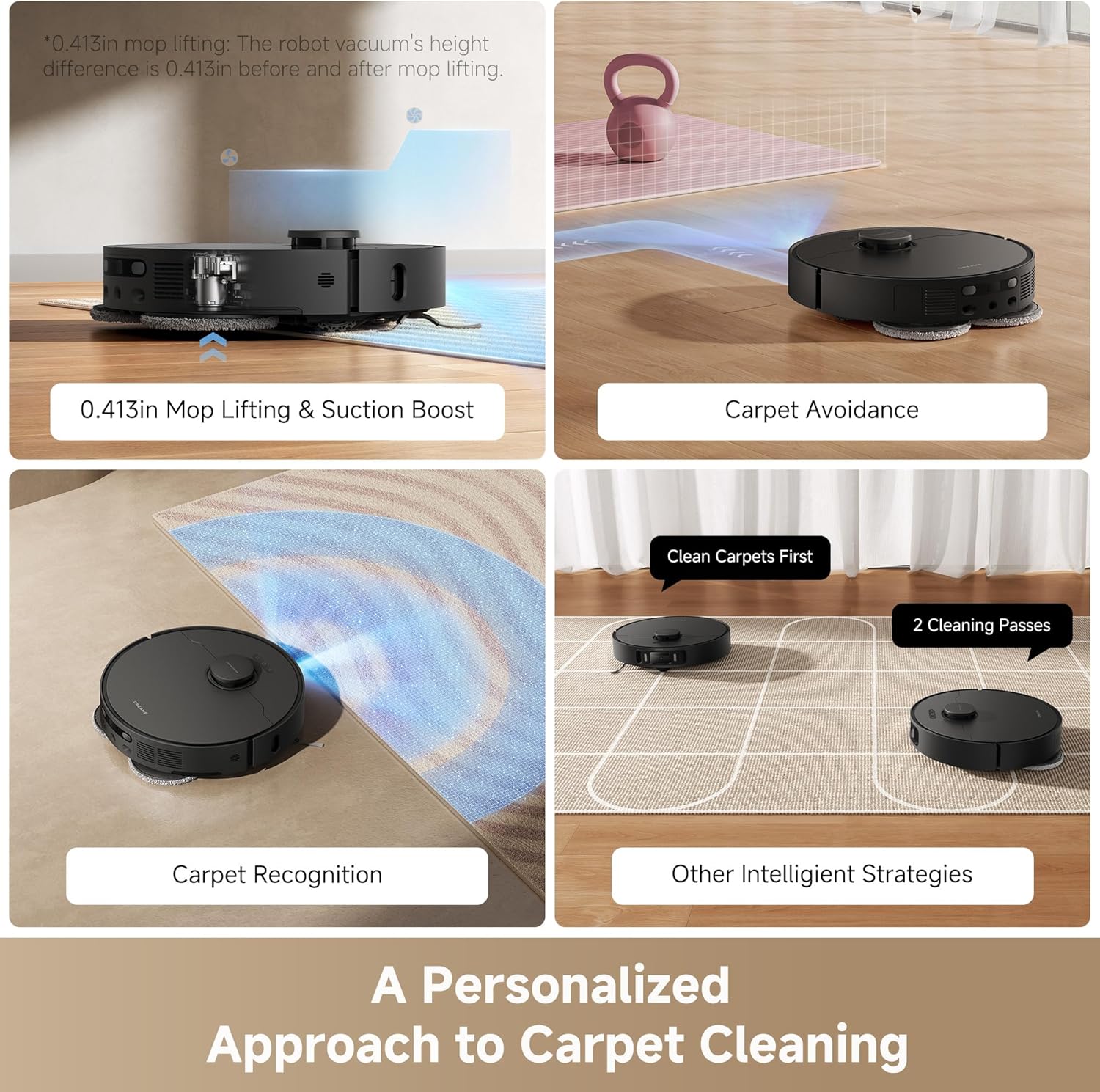 Pet-Friendly Features with Smart Carpet Modes Customize carpet cleaning with options like suction boost, mop lift (up to 10.5mm), or zone avoidance. Ideal for pet owners, it detects and avoids pet-related objects and supports real-time video calls and two-way voice interaction for added peace of mind.