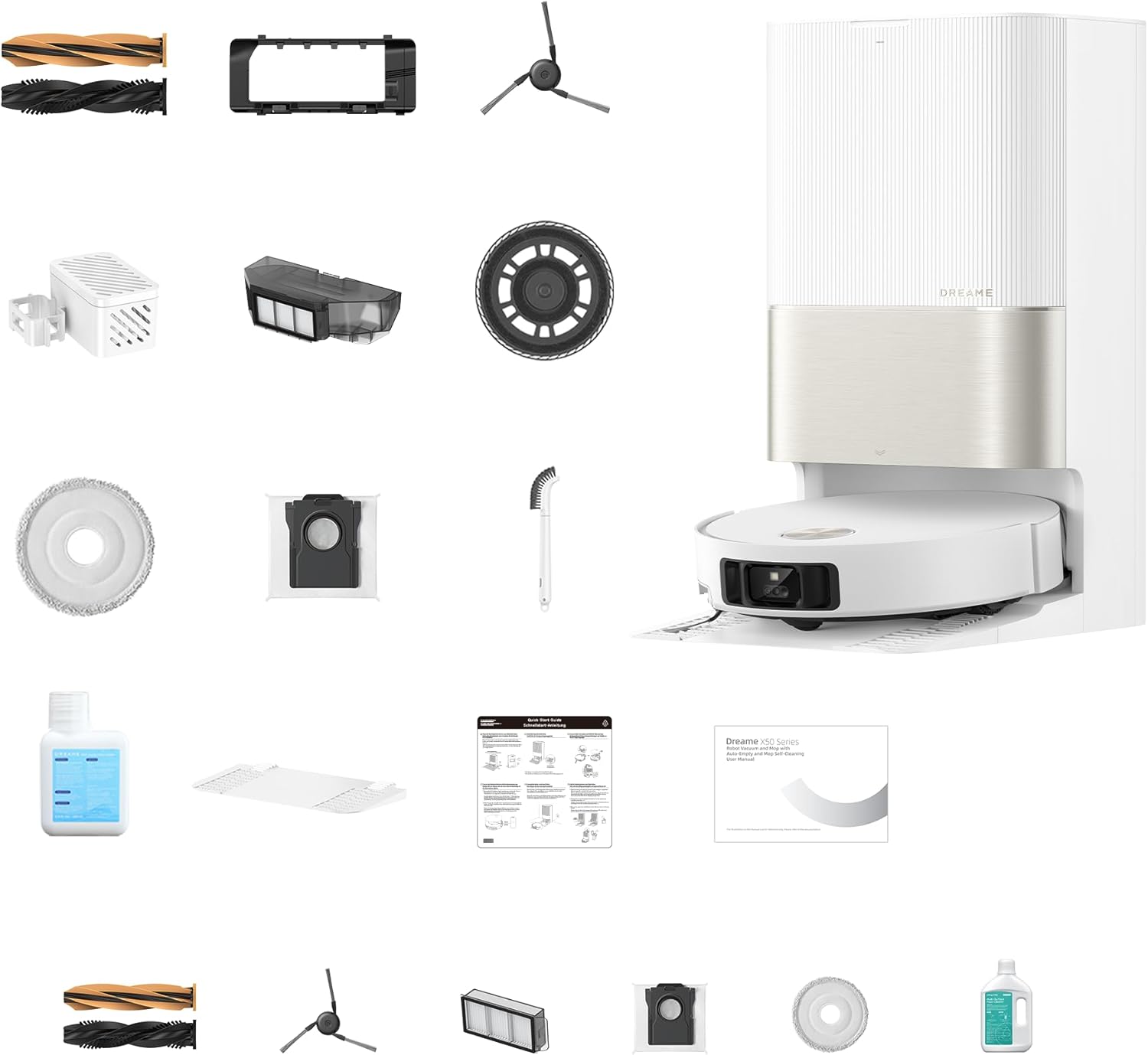 What you get: X50 Ultra*1, DuoBrush*2, Side Brush*3, Dust Bag*5, Filter*4, Cleaning Solution*1, Mop Pad*14