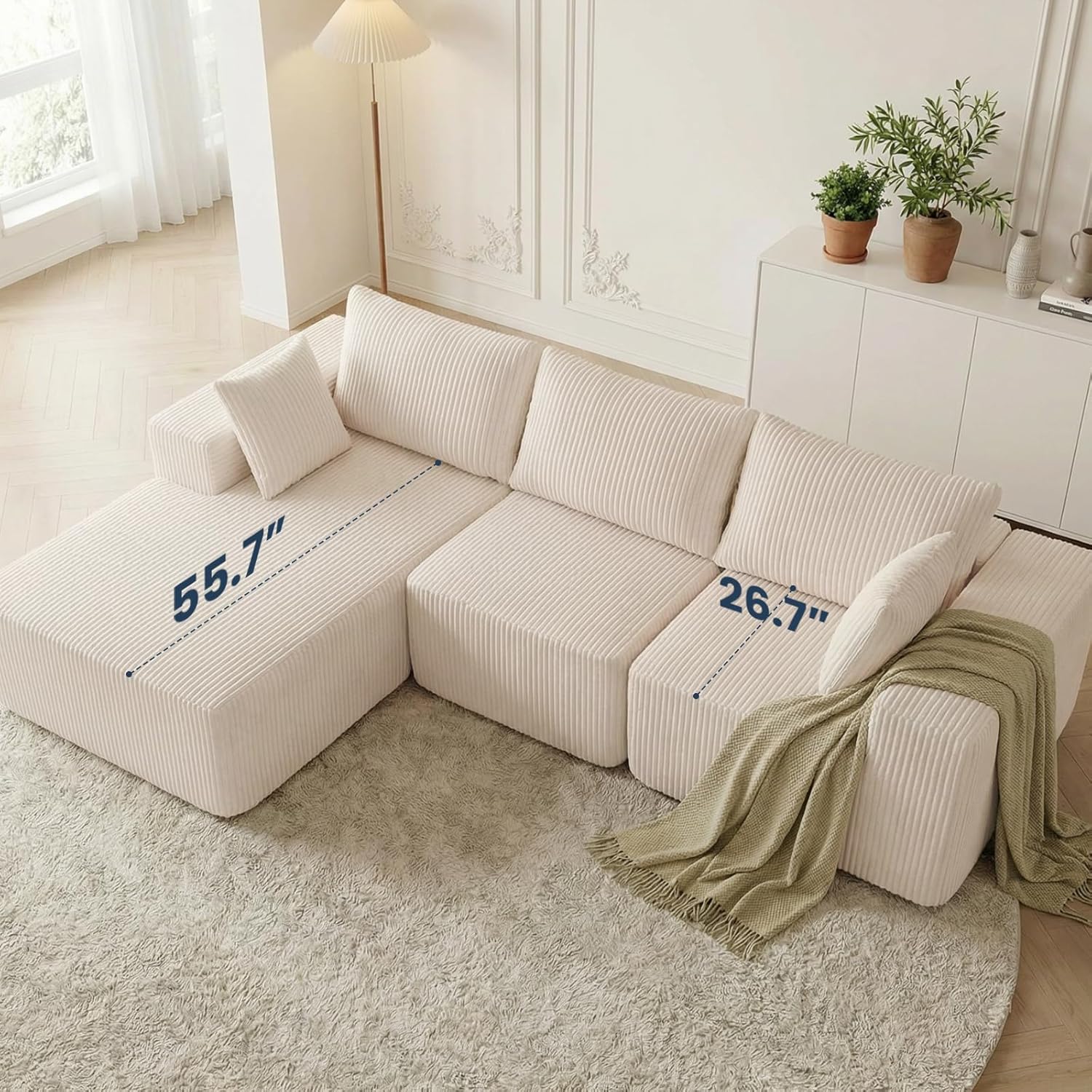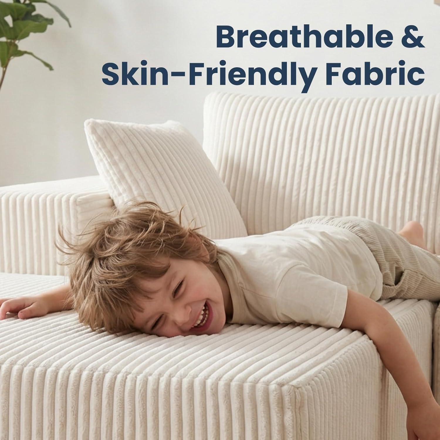 Comfortable Sectional Couch The cloud couch is made of skin-friendly, breathable, and stain-resistant corduroy fabric, designed with high-resilience foam for superior support and long-lasting durability with 3 removable back cushions and 2 throw pillows, providing you with a super comfortable experience. The anti-slip design at the bottom ensures the stability of the sofa. The comfy sofa cover is machine washable and can be cleaned when dirty.