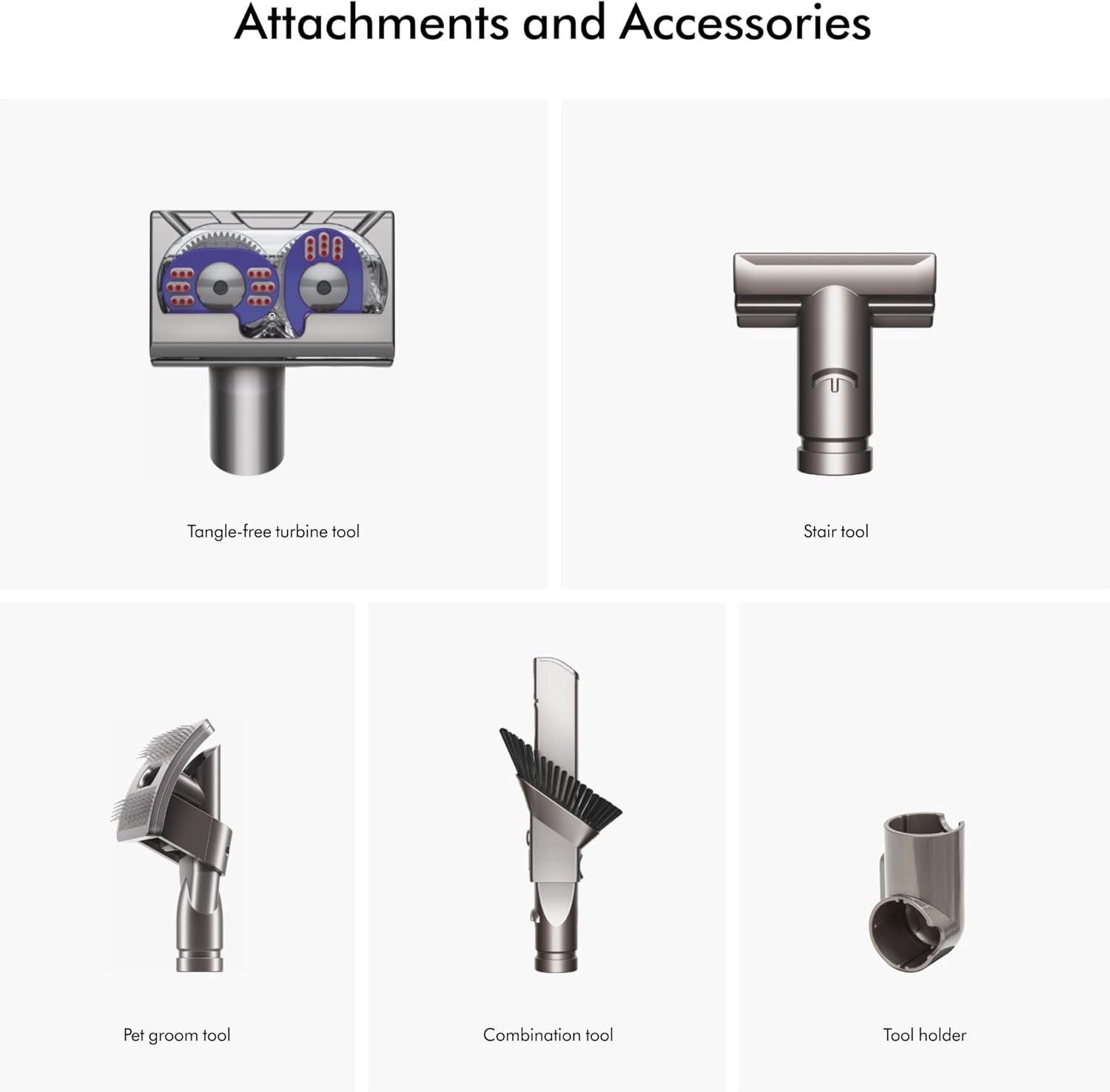 5 -Engineered accessories. Tangle-free turbine tool, groom tool, tool holder, stair tool, combination tool.