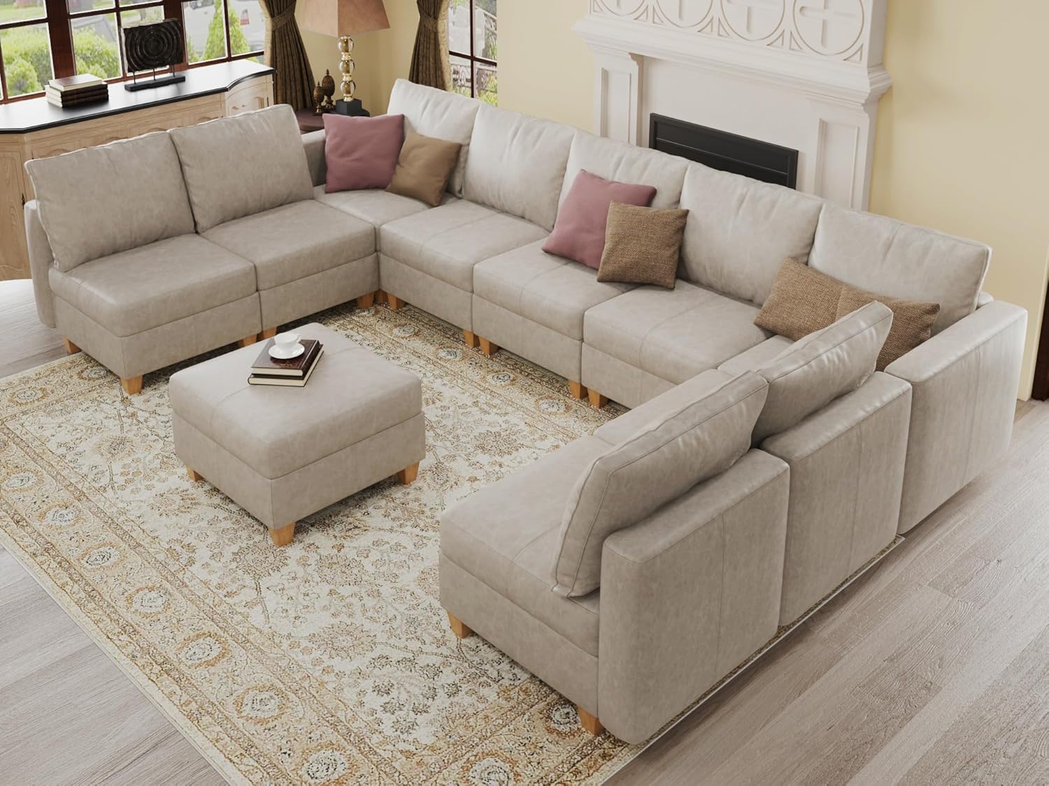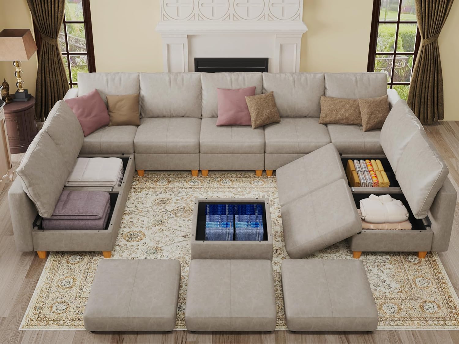 Affordable Seat Cushion Replacement Option:The modular sectional sofa features seperate seat cushions design.This feature is particularly appreciated if you want to rotate the pieces regularly to prevent uneven wear or after years you could just buy seat cushions only not just the whole modular sofa set.Really good value for money.Every ottoman has great hidden storage space(22.83"(L)*22.83(W)"*7.54"(H)approx).