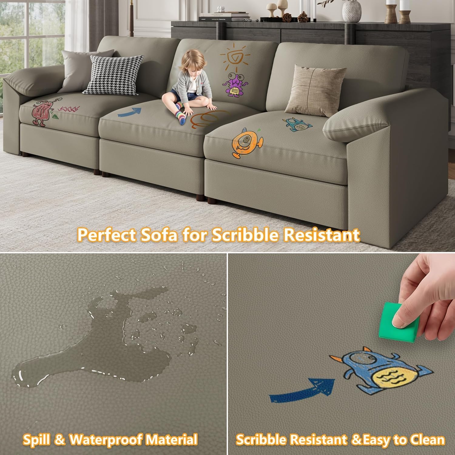 Easy to Clean and Maintain: This Faux Leather sofa is very easy to clean. You don't have to worry about the kids who like to scribble on the sofa because this sofa only requires a eraser to wipe the scribbles away.The sofa's seat cushions, backrest pillows, and armrest pillows are all Removable for easy daily cleaning.
