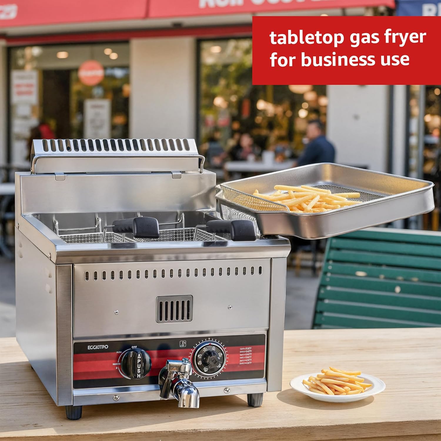 Large Capacity, Space-Saving Design: The weight of the gas fryer is 33LB (15kg), with a 22.5L large oil tank. The compact is 15.7" 19.7" 18.5"(425047cm). this countertop fryer is the ultimate solution for food trucks, concession stands, and small delis where space is at a premium. The heavy-duty stainless steel construction ensures dent and rust resistance for long-term commercial use.
