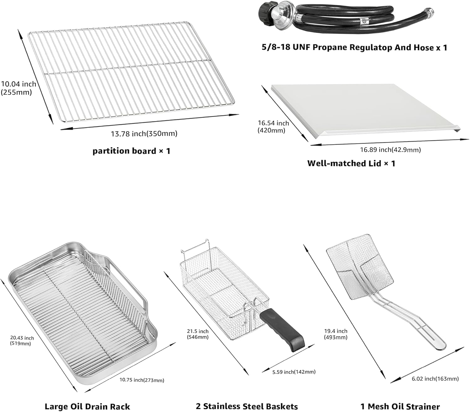 Ready To Use With Complete Kit: No more extra trips to the hardware store. We provide a full installation kit including an adapter 5/8-18 UNF gas connectiongas hose. Equipped with 2 baskets featuring thickened cool-touch handles for safety. 2 fry baskets for simultaneous or batch processing of different ingredients, significantly boosting serving efficiency. Whether for a restaurant, snack bar, or mobile catering event, this propane fryer ensures consistent, golden-brown results every time.