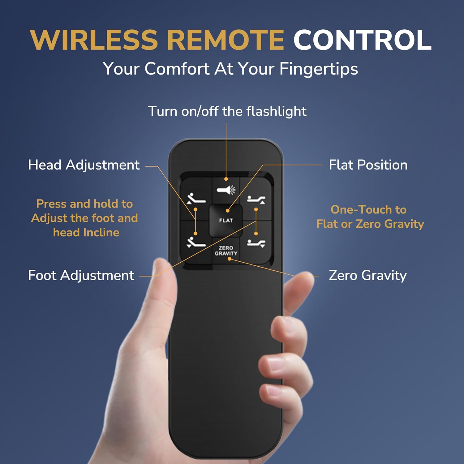Personalized Ergonomic Zones: 58 head elevation (stops acid reflux) + 37 leg lift (boosts circulation) - Preset Zero Gravity or Flat with the wireless remote. Experience surgical-grade positioning for reading, reflux relief, or sciatica care.