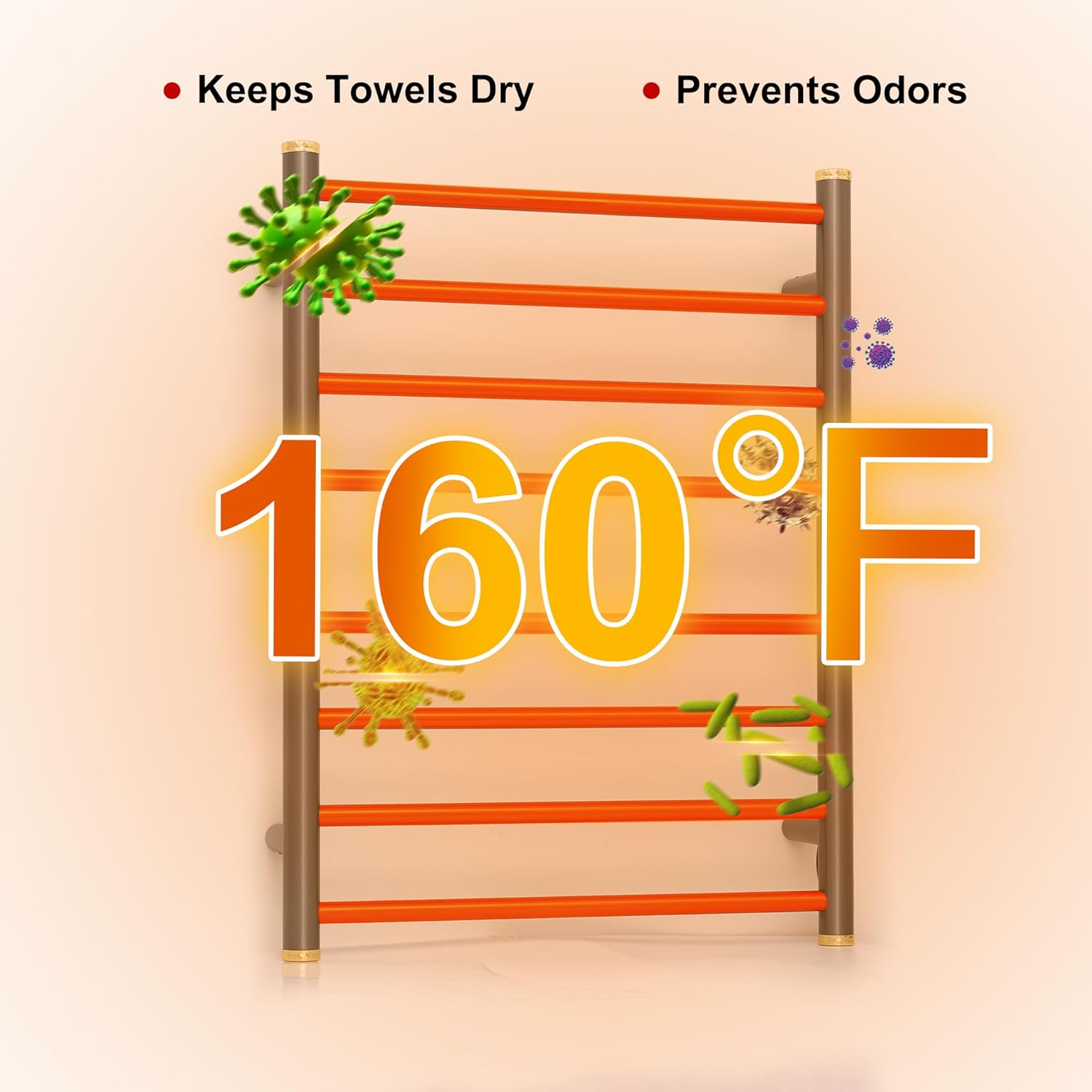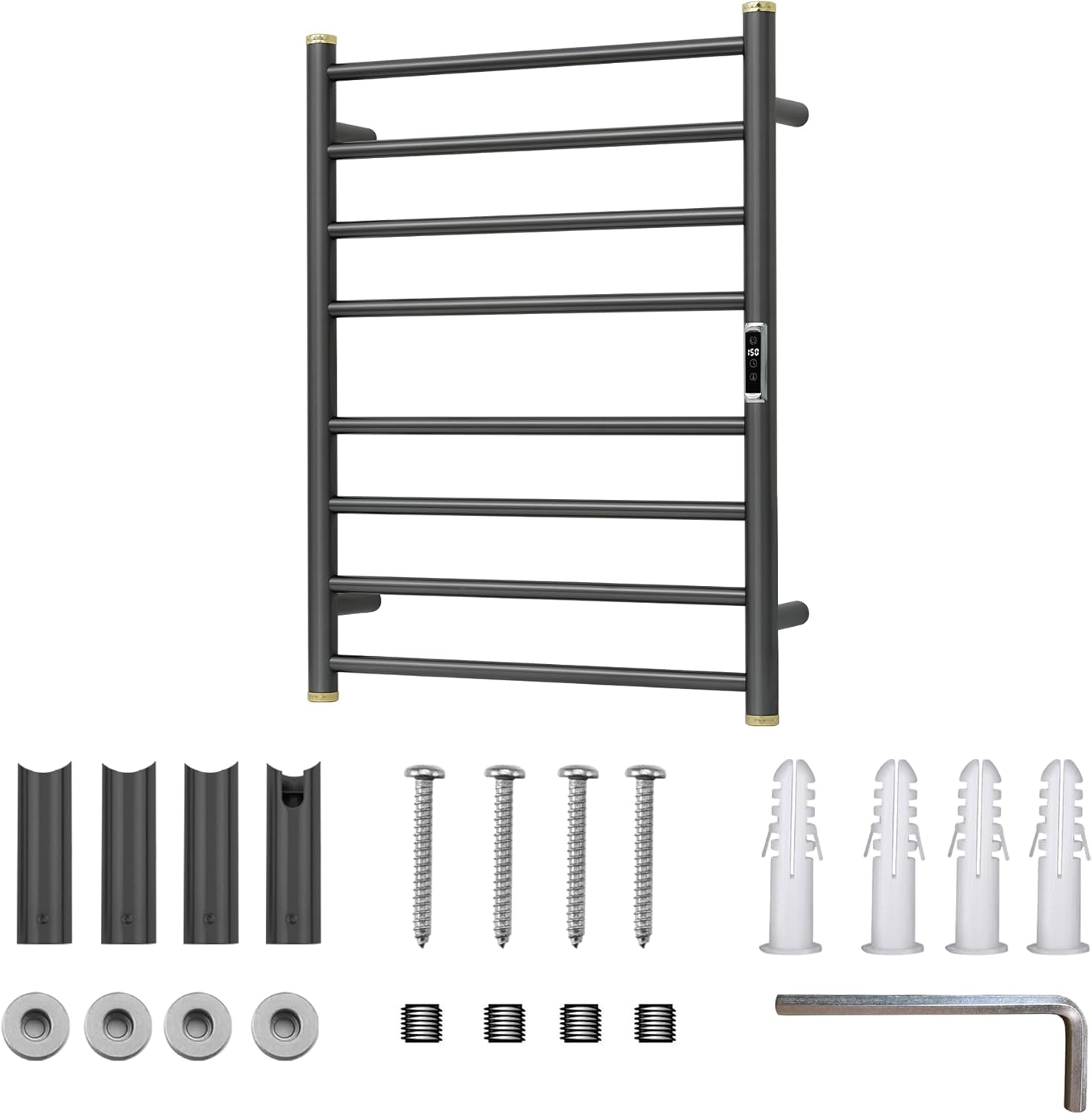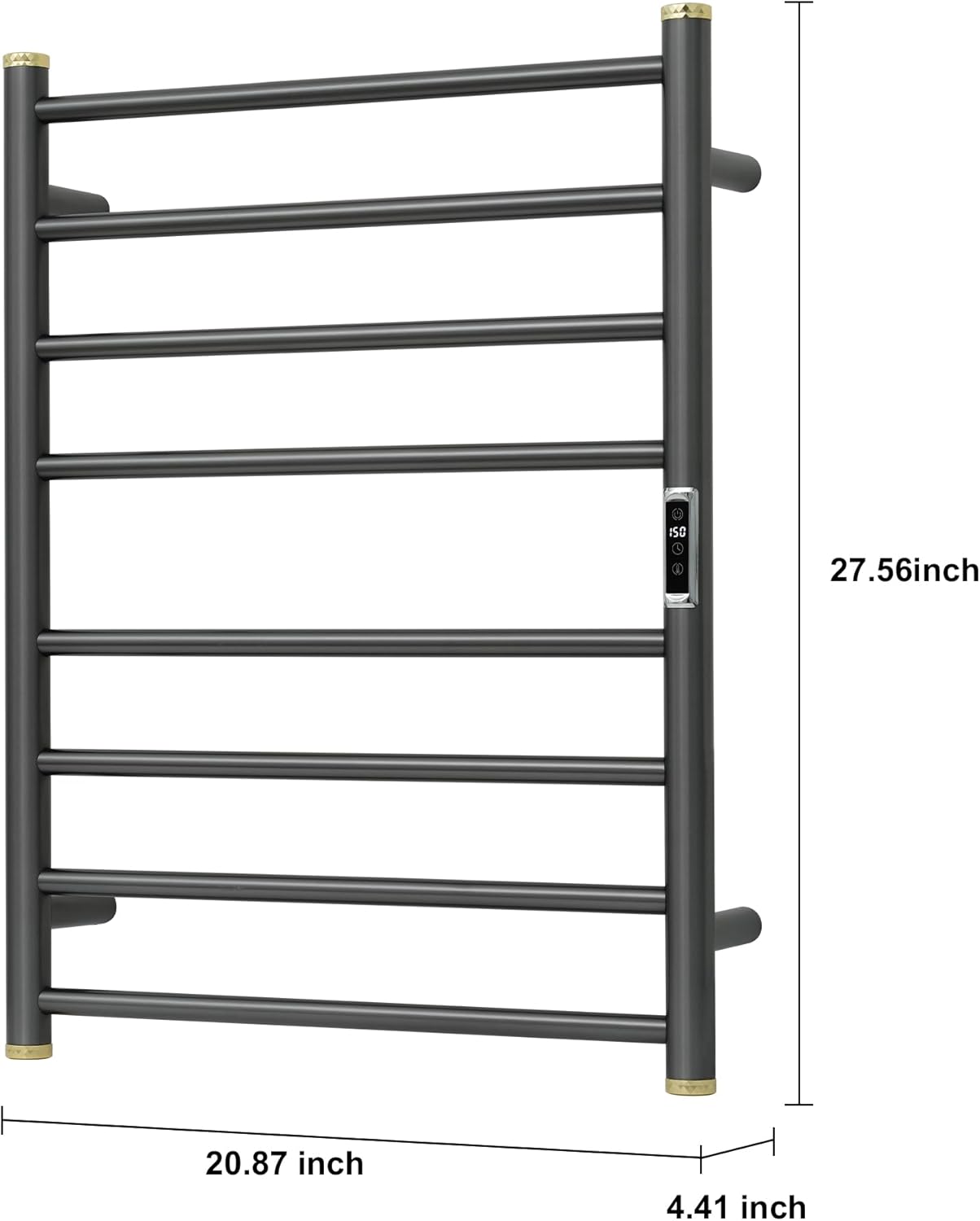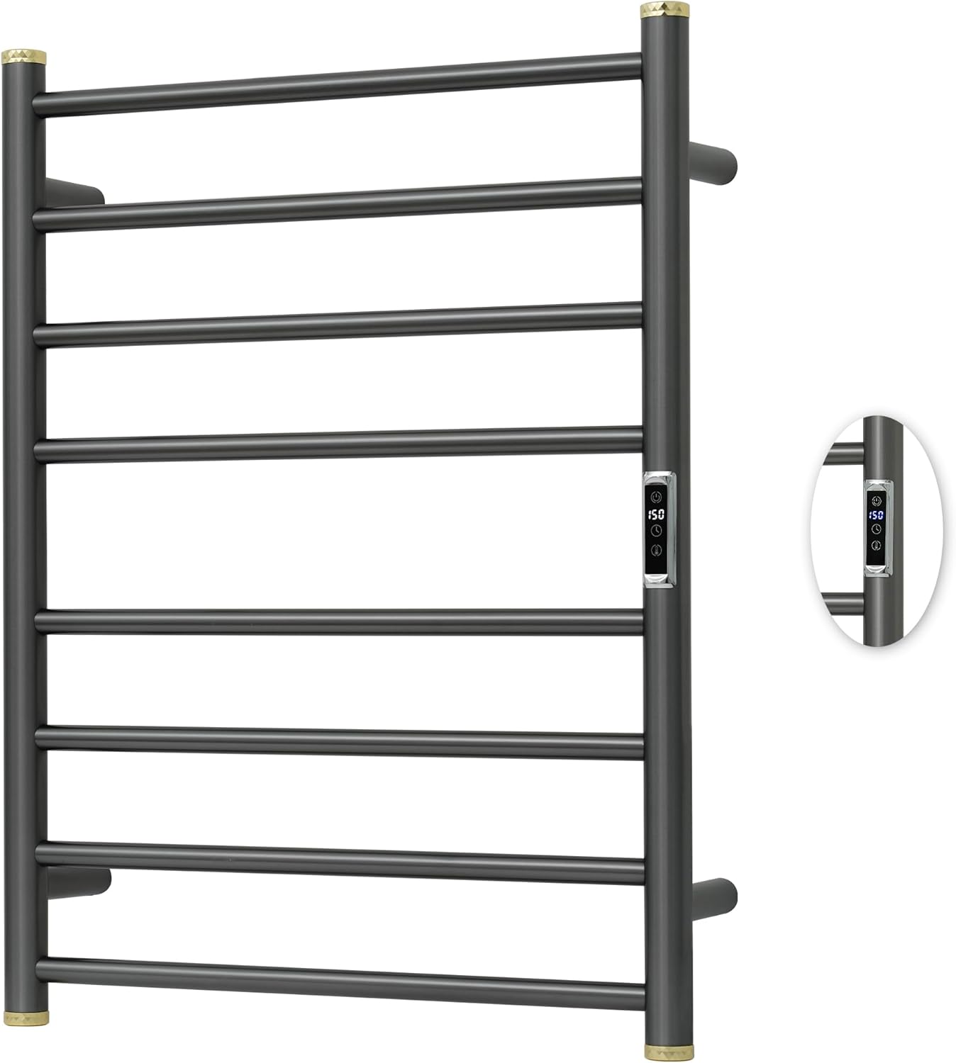 Two-Tone & Touch Control Gunmetal Grey bars & gold end caps metal towel warmer,Timer & Temperature Control. Adjust temperature (100F160F, 10F steps), set 1-8H timer, LED screen displays real-time statussafety technology with automatic overheat protection ensures child-friendly operation, preventing surface overheating risks.