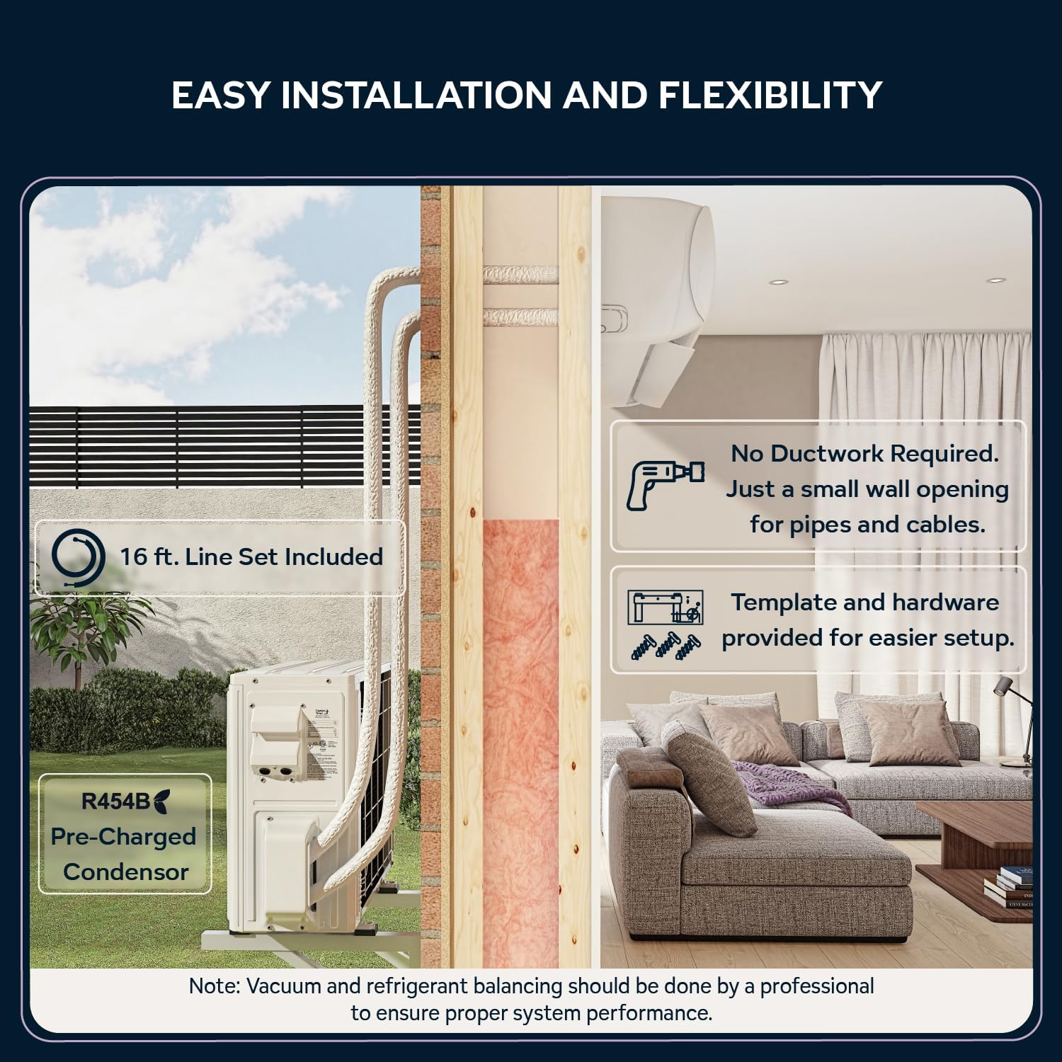 COMPLETE INSTALL KIT + ECO-CONSCIOUS REFRIGERANT : Includes a 16.4 ft. copper line set, pre-charged R454B refrigerant, drain hose, wiring, and wall sleeveeverything needed for a full install. R454B is a next-gen refrigerant with ultra-low Global Warming Potential (GWP), reducing your environmental impact. Many install steps can be completed by a contractor or homeowner, but refrigerant balancing should be performed by a certified HVAC technician.