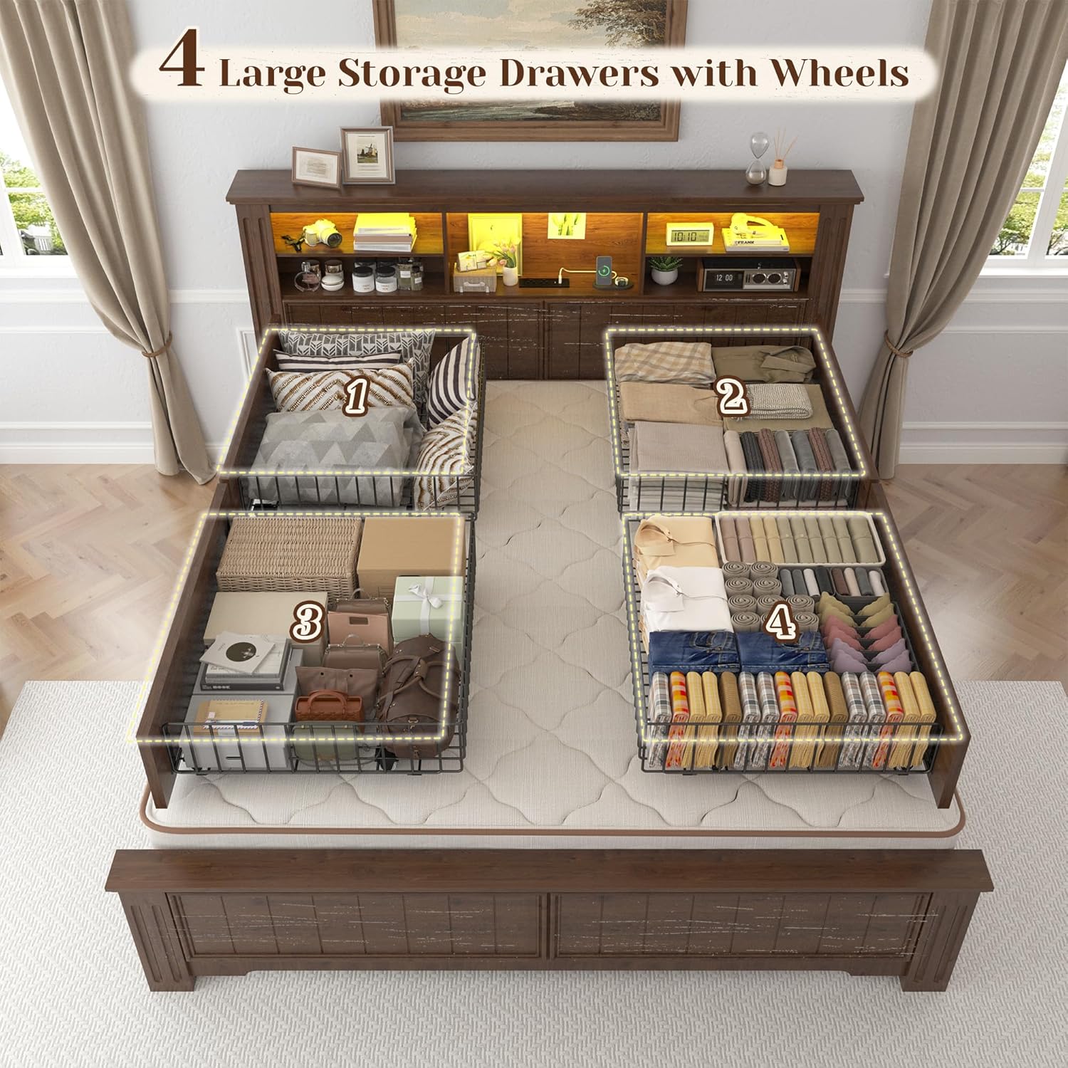 4 Storage Drawers & 47"H Headboard Full Bed Frame The Full size bed frame comes with 4 spacious under-bed drawers, offering plenty of storage space for up to 20 sets of bed sheets, 180 off-season clothes, and 180 T-shirts. Besidesthis bed frame Full size drawers are equipped with rolling wheels for easy access.All these storage drawers help maximizing bedroom space and keep room tidy and organized.