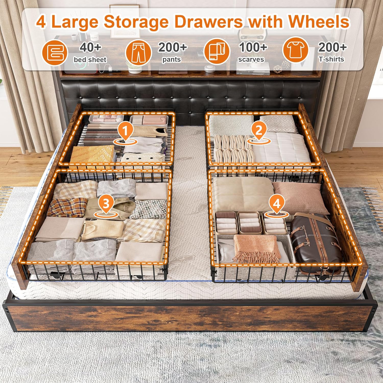 No Noise King Bed Frame with Storage Are you still struggling with a squeaky bed frame king size? king bed frame with storage is equipped with EVA mute bars to avoid friction between metal slats, effectively eliminating noise. This king size bed frame and headboard ensures your comfort and relaxation. No squeaks or creeks when you laying down.