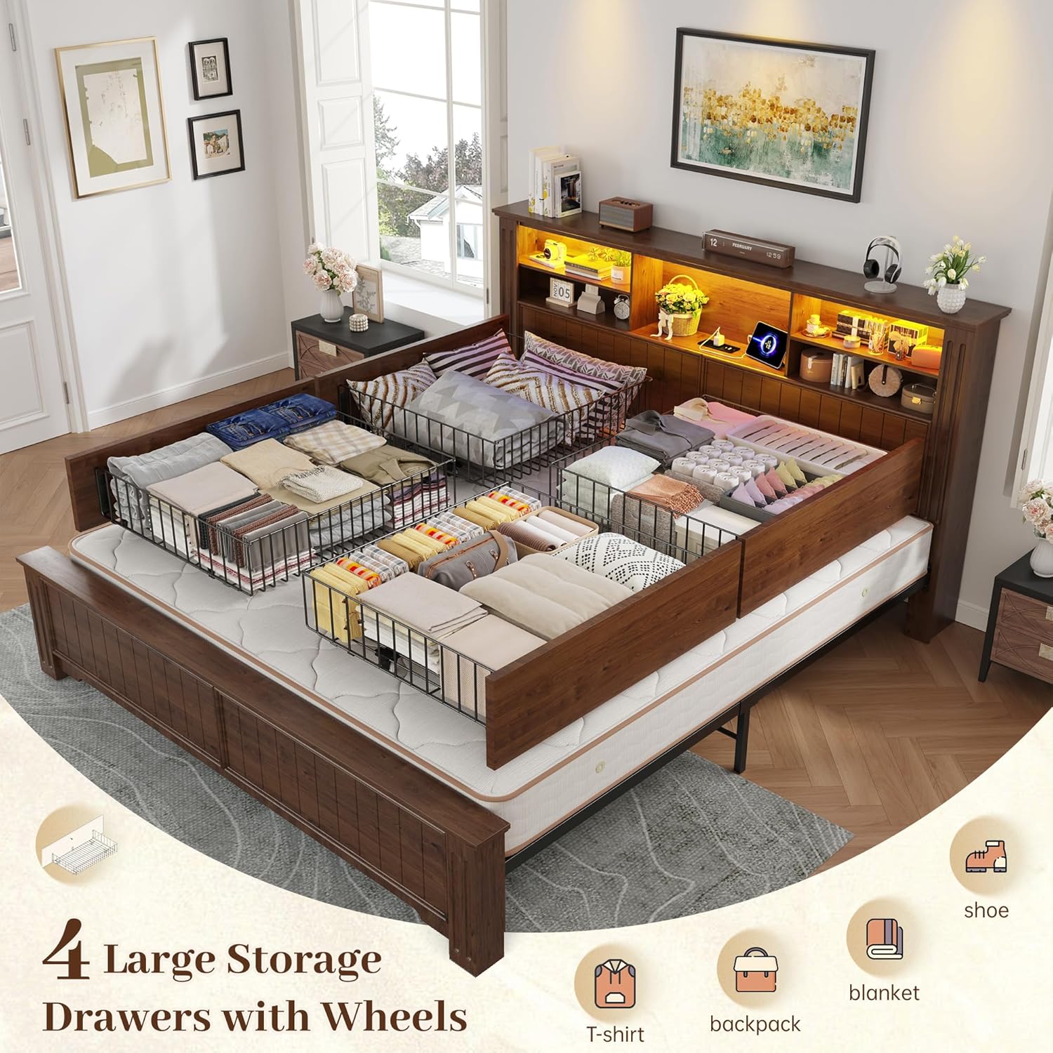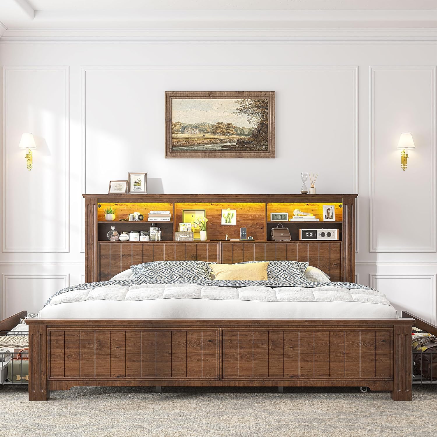 Built-In Lighting + ChargingThis king size bed frame with headboard has special retro outline design,make the bed benifit your homestyle. With the RGB LED light strip on the headboard,the bed frame king size perfect for late-night scrolling or lighting up the room in your favorite color.You can adjust the color by the remote control (Include).The king bed frame also comes with 2 standard plug outlets, 1 charging port, and 1 Type-C port on the headboard, so you can easily charge all your electronic devices on bed at once. Convenient your life with functional king bed frame.