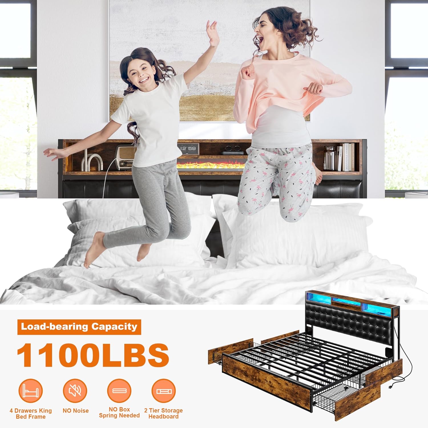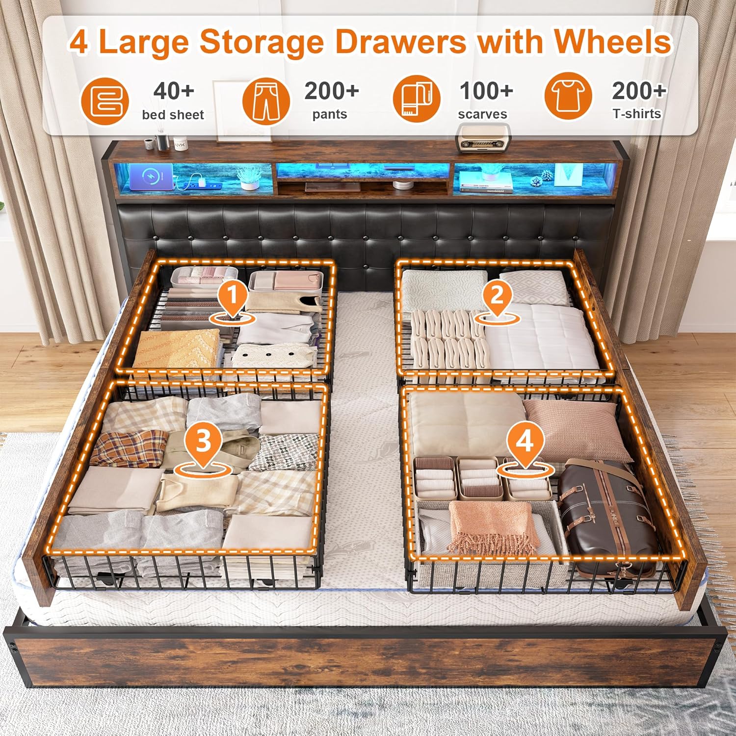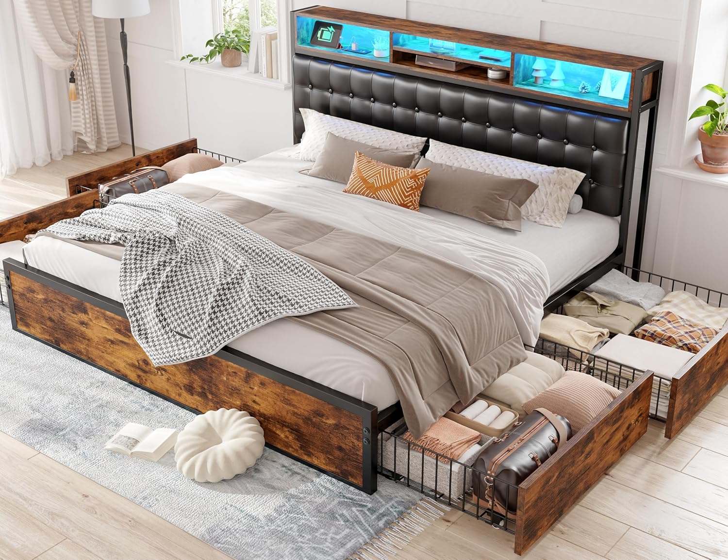 King Size Bed Frame with 4 Storage Drawers, LED Headboard