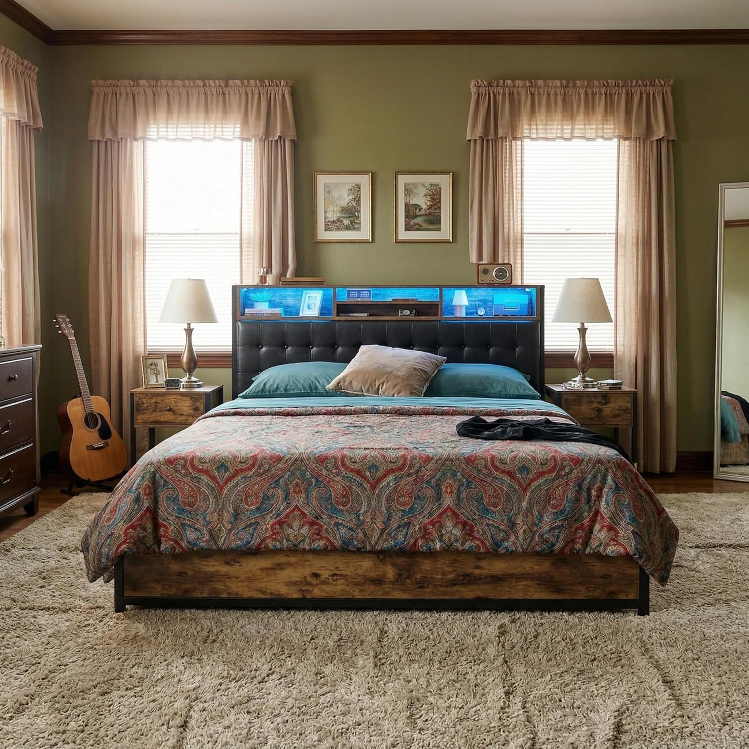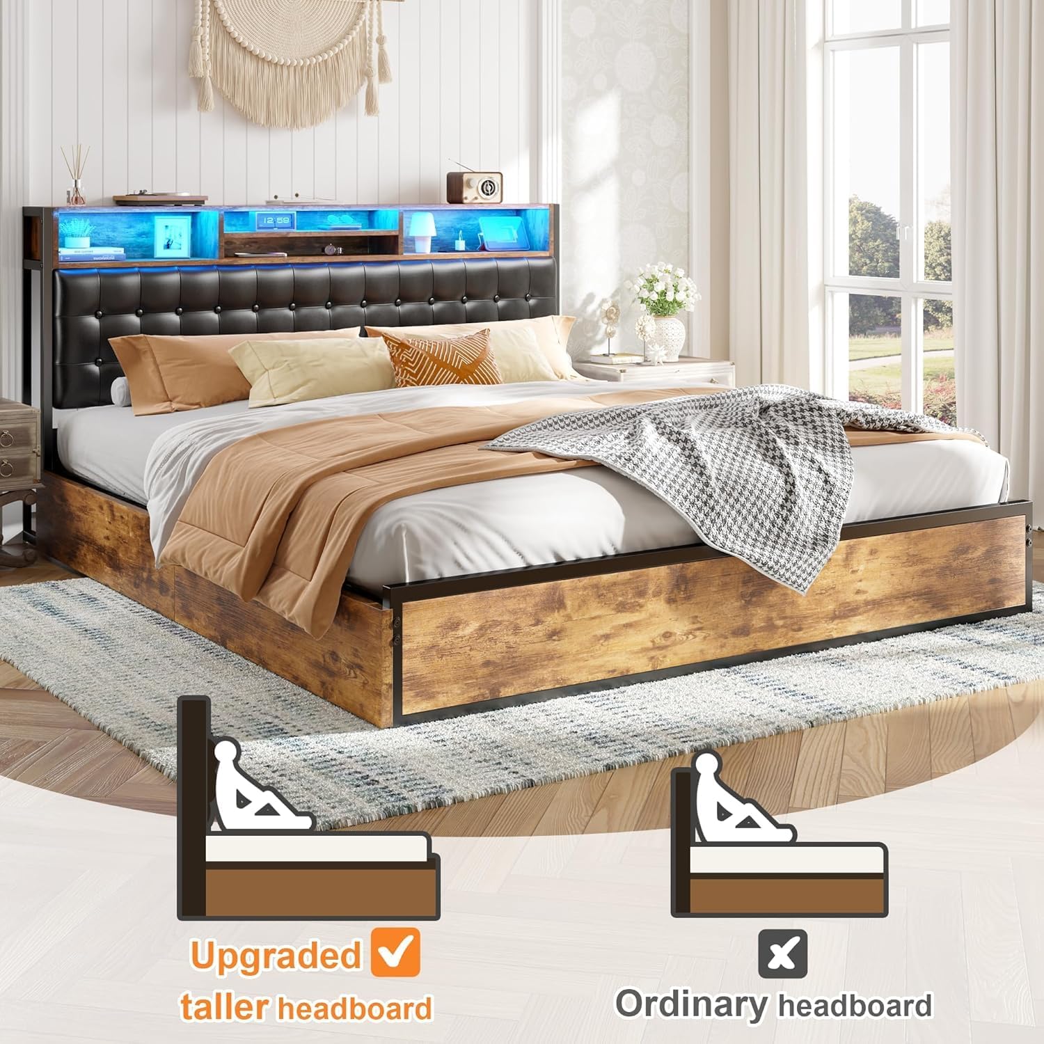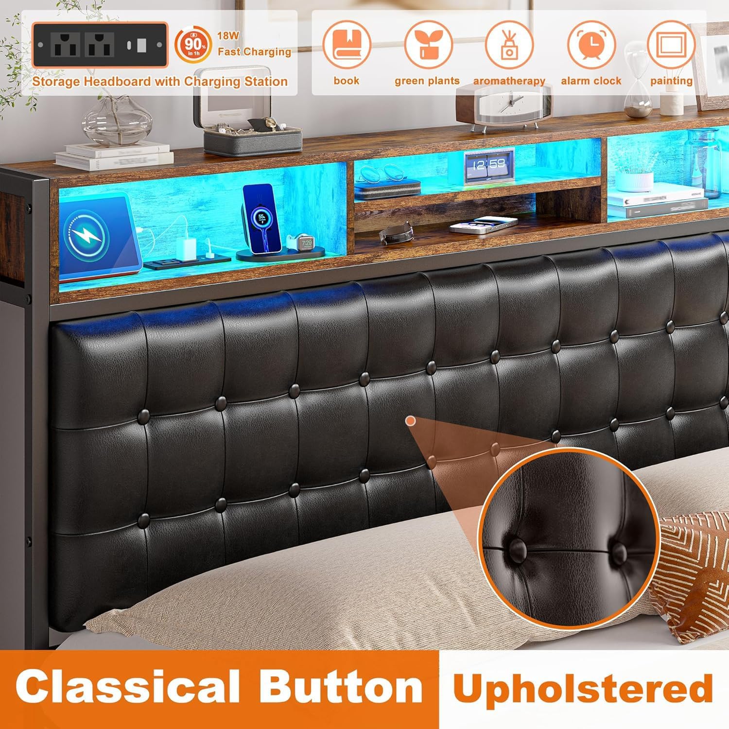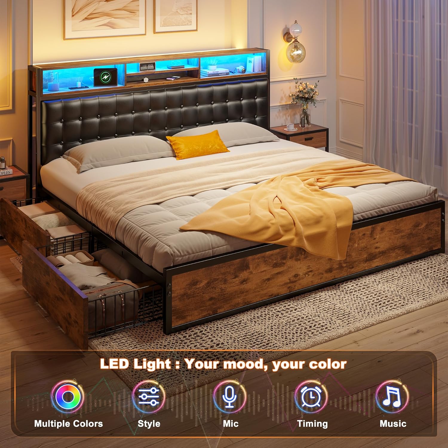 20-Color LED Lighting & Built-In Charging Station Create your perfect ambiance with customizable LED lights featuring 20 vibrant colors, controlled via remote or smartphone app. The multifunctional built-in charging station includes Type-C port, USB port, and AC outlets, keeping all your devices powered within arm's reach. The 3-tier platform storage (4" extra space) perfectly organizes your phone, glasses, books, and dcor items for ultimate bedside convenience