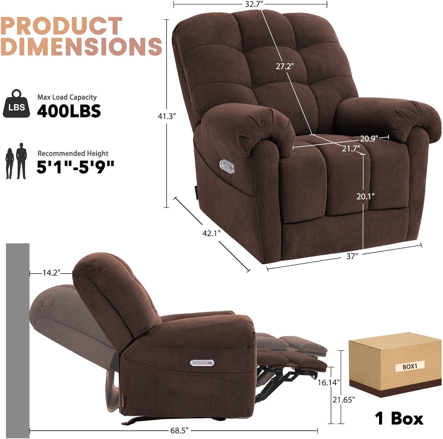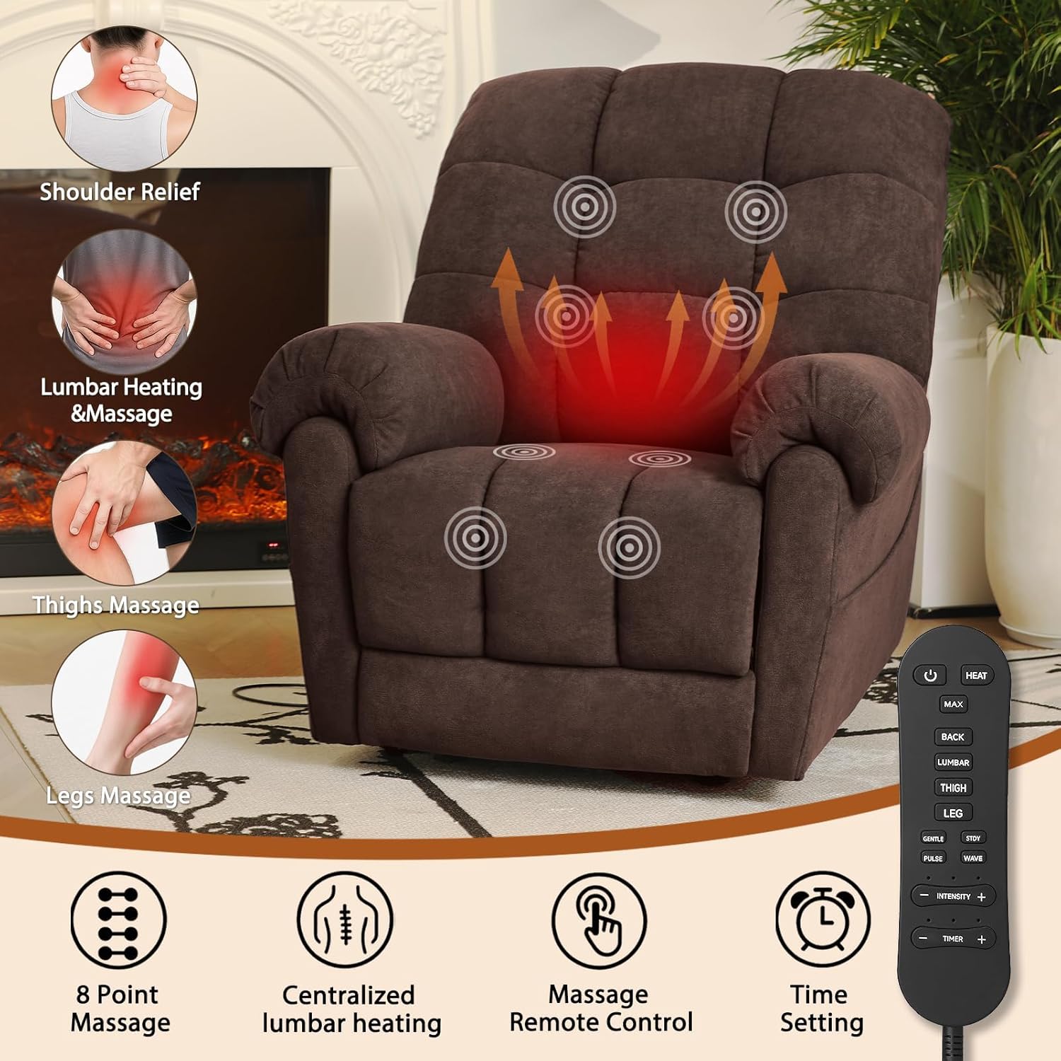Multifunctional Smart Features for Easy Use: One-touch reset: Press the "HOME" button to return the chair to the upright position in seconds, simple to operate and helpful for extending motor lifespan. Fast charging: Side-mounted USB and Type-C ports keep your phones, tablets, or other devices powered up while you relax. Heat & massage: 8 vibrating massage motors (29V) are embedded in 4 zones (shoulders, lumbar, thighs, calves), with 4 vibration modes, 3 intensity levels, and 3 timer settings (10/20/30min) adjustable via remote.