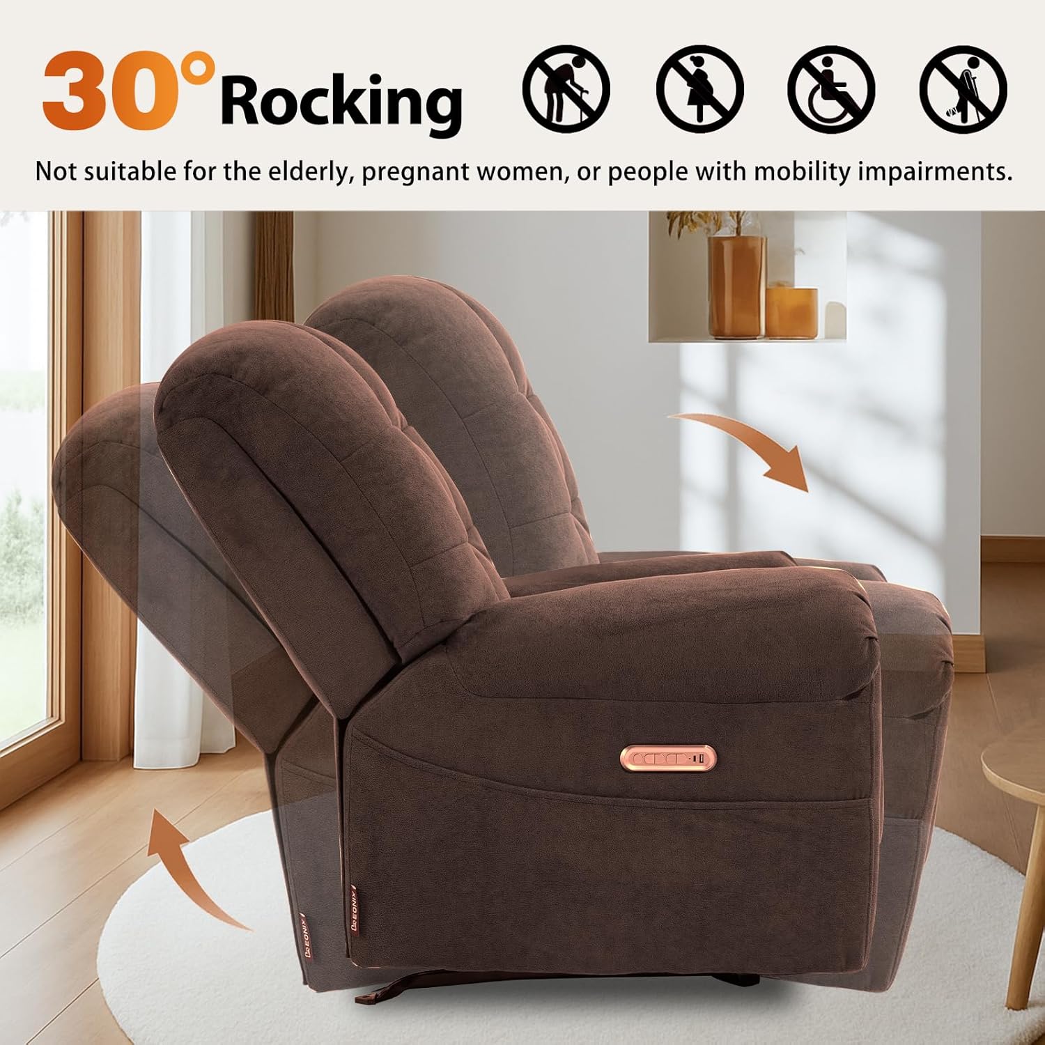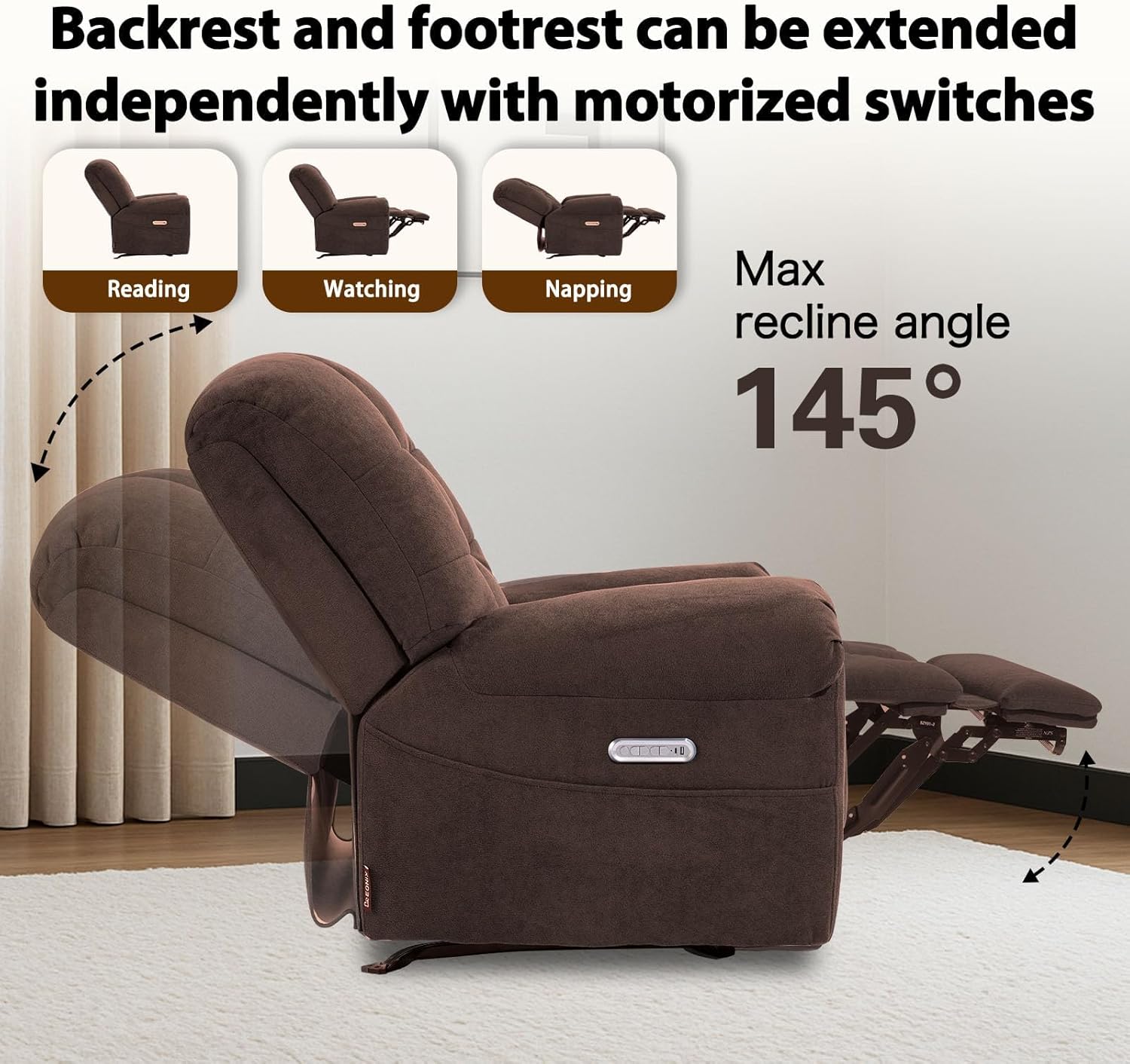 Dual-Motor Rocking System with TUV Certification for Custom Comfort: Our rocking recliner chair is equipped with TUV-certified quiet dual motors, enabling independent adjustment of the backrest and footrestno lift function, focusing on personalized rocking and reclining comfort. The backrest adjusts freely to 90 (in fully reclined position) and 145 (maximum recline); it also features a gentle 30 rocking motion, perfect for reading, napping, or casual relaxing. The stable rocking mechanism avoids sudden jolts, suitable for calm daily use. SPECIAL NOTES: In a seated position, the footrest can only be raised to 45-60.