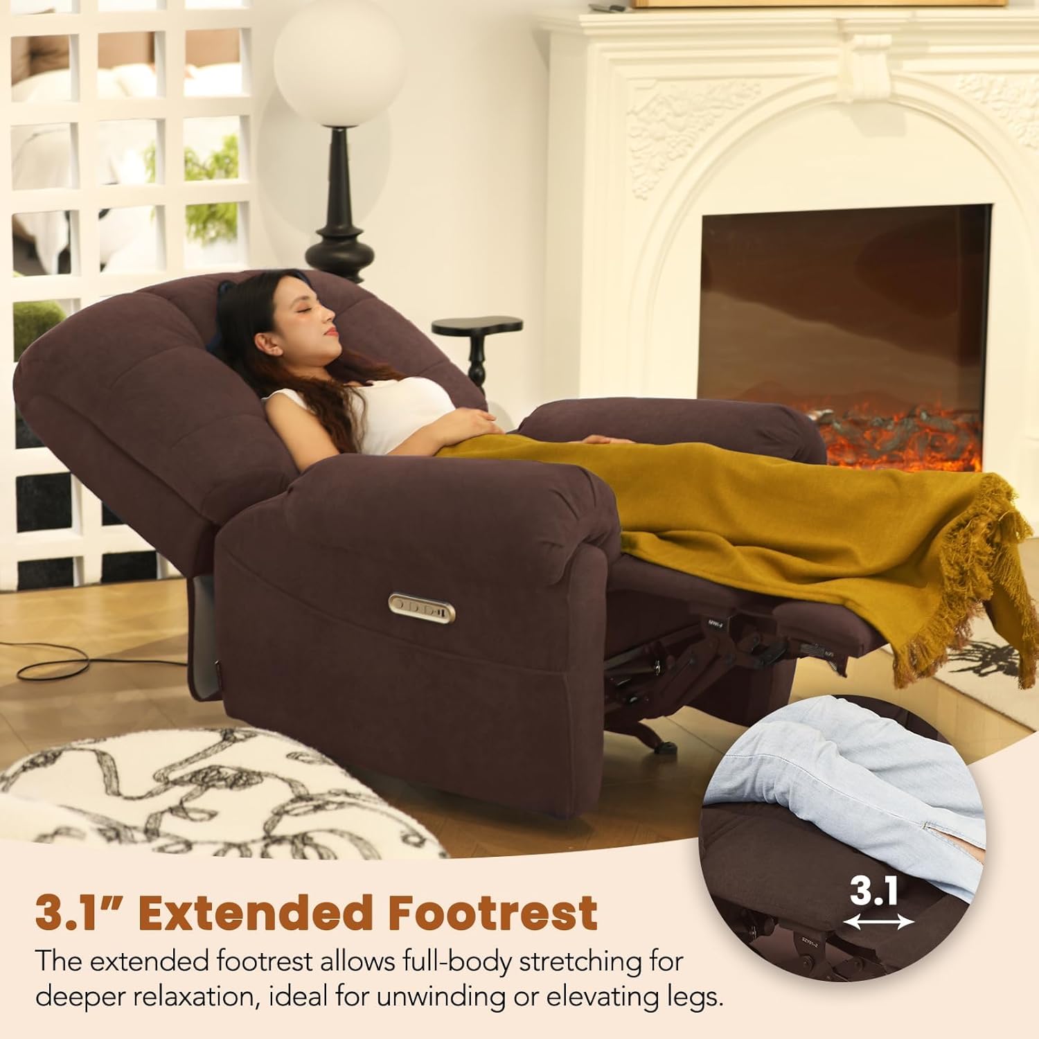 Ergonomic Design & Ideal Size: Included 3.1" extended footrest. This rocking recliner adopts dual-zone infinite position adjustment to fit different sitting/reclining habits. It is designed for users 5'1''~5'9'' tall, making it ideal for seniors, adults, and kids seeking personalized comfortwhether as a living room leisure chair or a bedroom napping chair. The safe 30 rocking amplitude works smoothly on various floor types (carpet, tile, hardwood floors) without scratching surfaces.