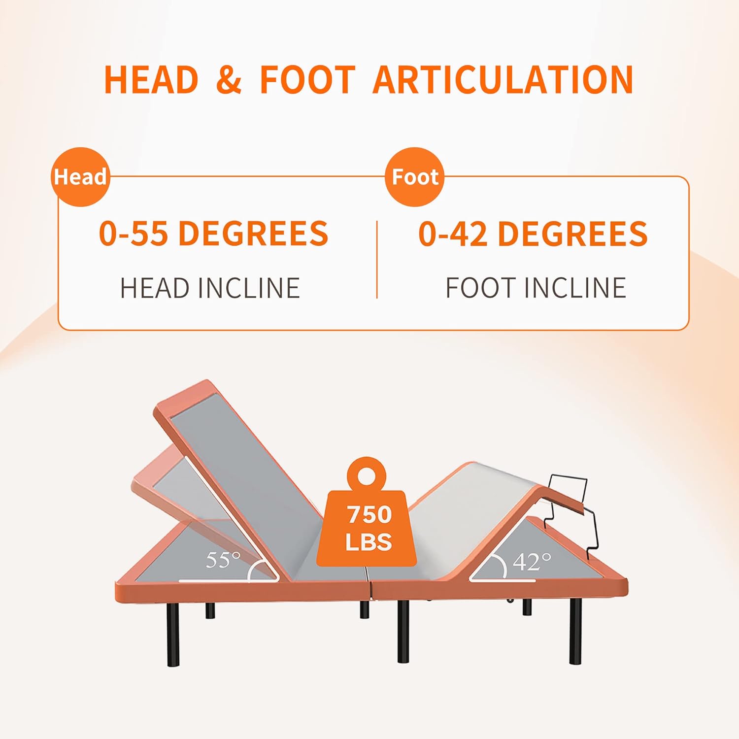 WIRELESS REMOTE - The E2000 twin xl adjustable bed frame can be operated by phone. The head and foot incline option which can head to 55 degrees and foot up to 42 degrees. The adjustable bed also can be controled by Wireless Remote control with convenient button.