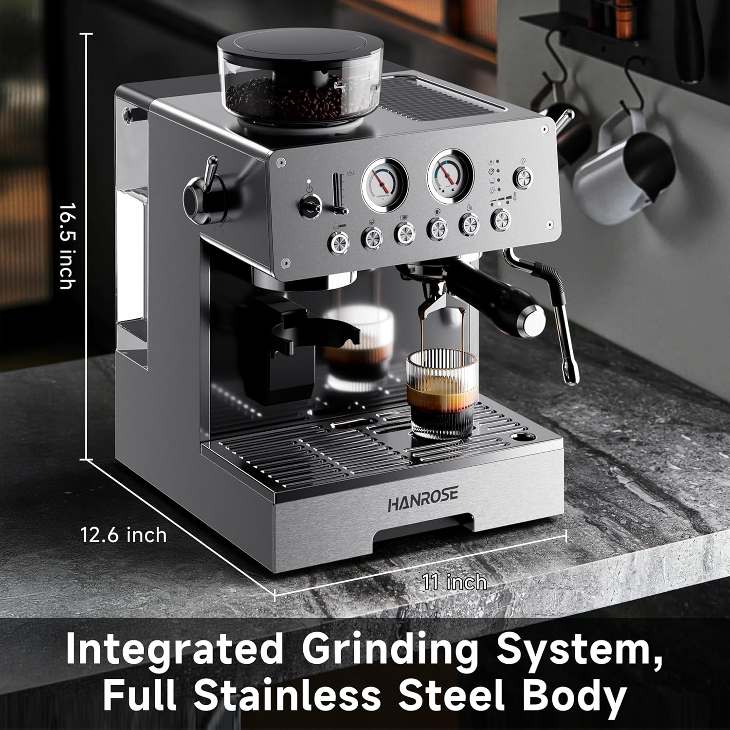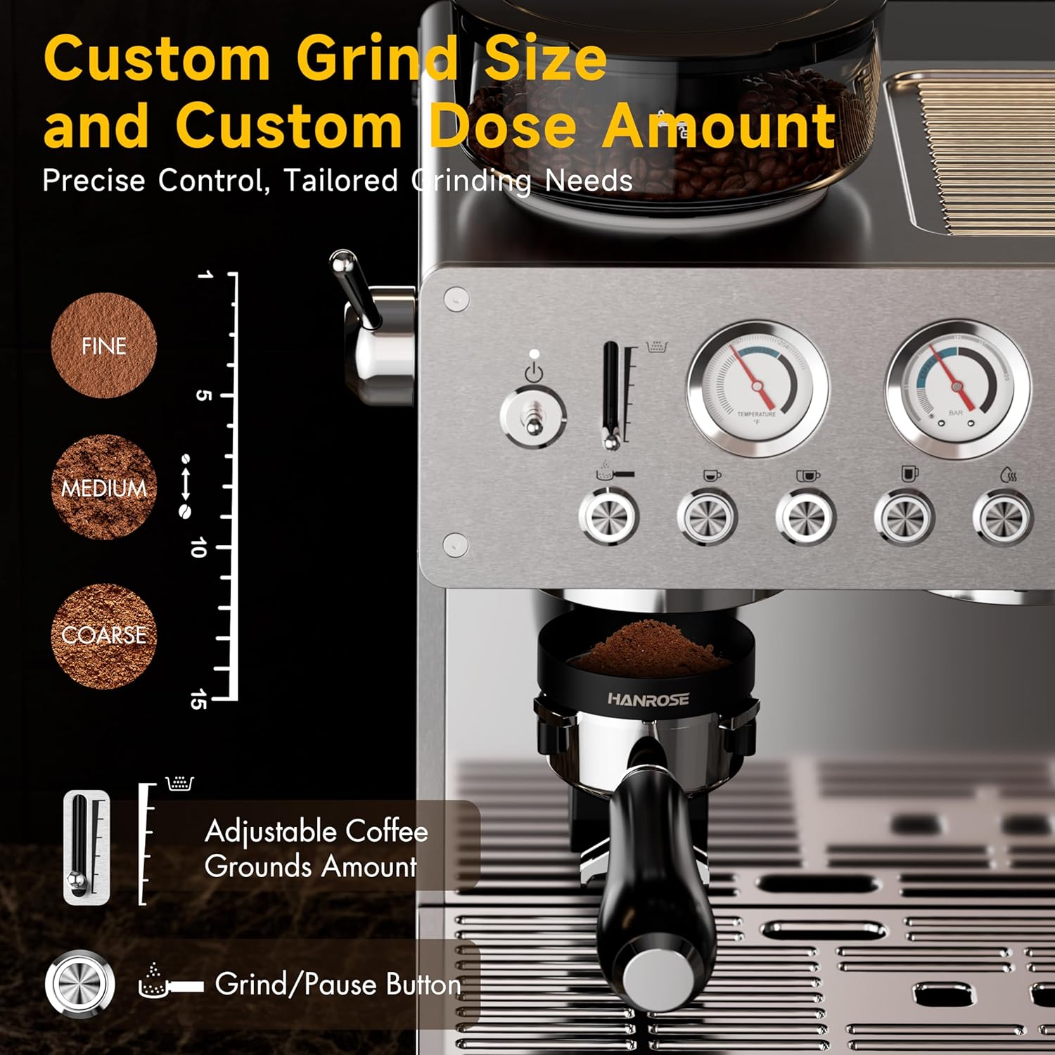 More Thoughtful and Professional Design Details This Espresso maker with grinder features a vintage brushed stainless steel design, combining elegance and durability. Precision buttons and real-time pressure and temperature gauges offer clear monitoring. The anti-static grinder ensures smooth operation, and the automatic pressure release and energy-saving modes enhance safety. Additional features include self-cleaning, signal light, cup-warming, a 200g hopper, and a 3L water tank.