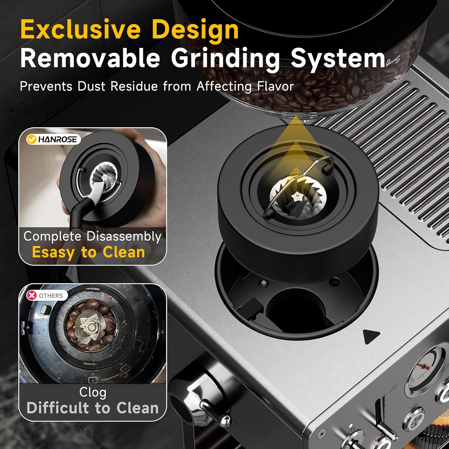 Grind and Brew in One This Espresso machine with grinder built in offers 15 customizable grind settings and adjustable coffee output, accommodating a wide range of coffee beans. Its unique detachable grinder system minimizes residual coffee powder buildup, ensuring a clean and pure flavor in every cup. The fully removable grinder blade design makes cleaning effortless, preventing clogs and extending the machine's lifespan, providing coffee enthusiasts with a long-lasting, high-quality brewing experience.
