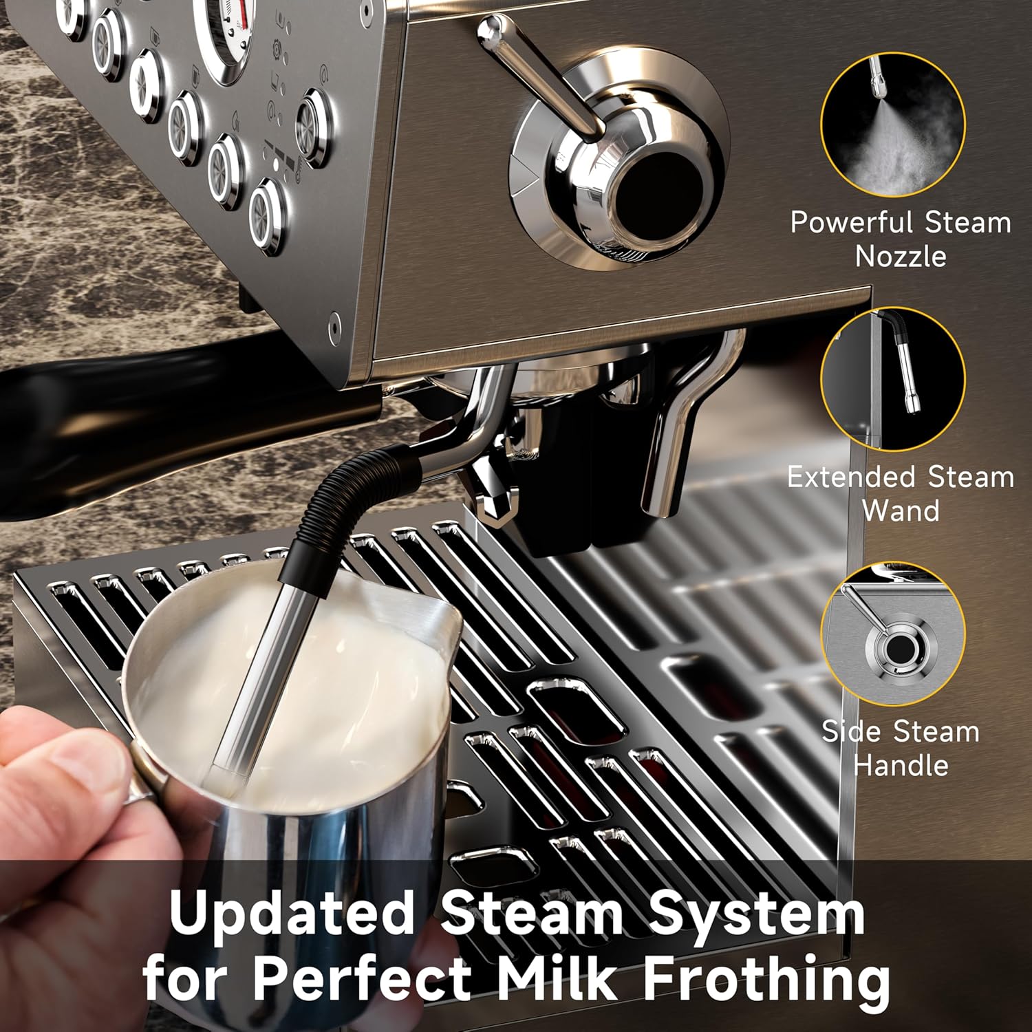 Upgraded Steam Function This Espresso machine features a side-mounted steam wand for smooth operation, enhancing your brewing experience. The extended, rotatable stainless steel steam pipe allows versatile frothing angles to meet different milk texturing needs. The powerful steam nozzle froths milk in just 30 seconds, making it easy for beginners to master frothing. With a dedicated stainless steel frothing pitcher, this machine serves as both a cappuccino and latte maker, delivering caf-quality foam at home.