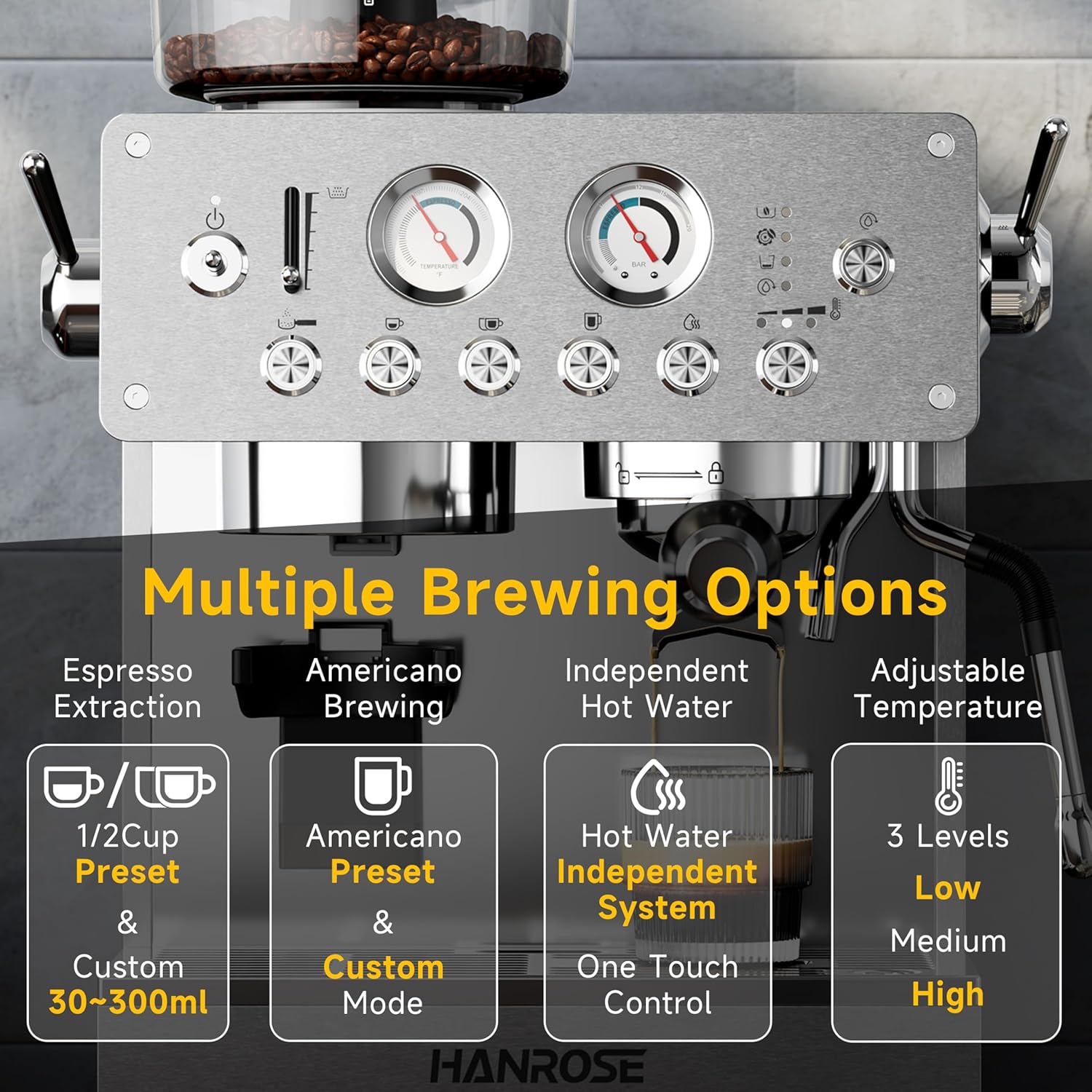 More Thoughtful and Professional Design Details This Espresso maker with grinder features a vintage brushed stainless steel design, combining elegance and durability. Precision buttons and real-time pressure and temperature gauges offer clear monitoring. The anti-static grinder ensures smooth operation, and the automatic pressure release and energy-saving modes enhance safety. Additional features include self-cleaning, signal light, cup-warming, a 200g hopper, and a 3L water tank.