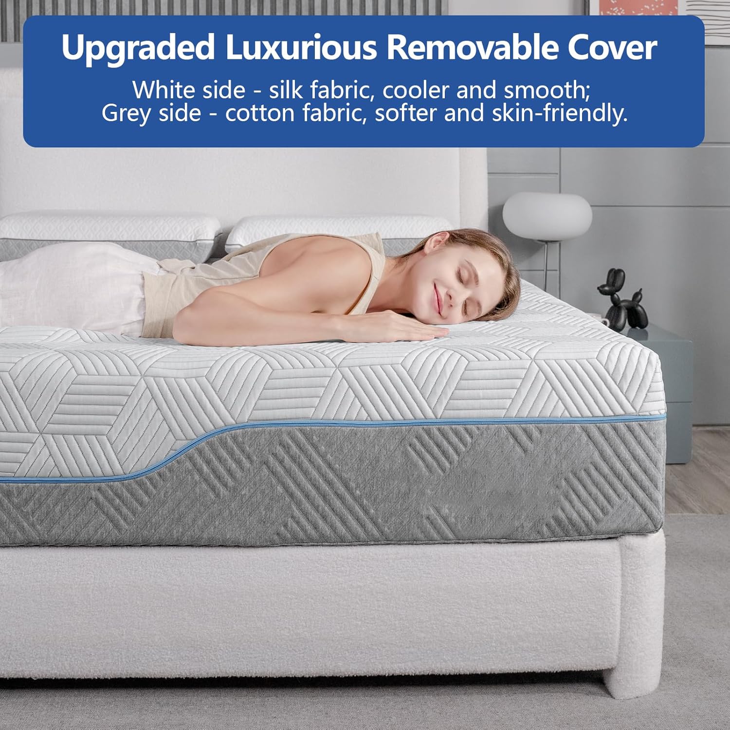 UPDATED FIBERGLASS-FREE COVER : Our green tea gel mattress features a luxurious silk cover, cool and smooth, to allow you to also enjoy a safe deep sleep in summer. The other side has stylish grey fabric, soft and skin-friendly. Change the cover of the mattress according to your mood.