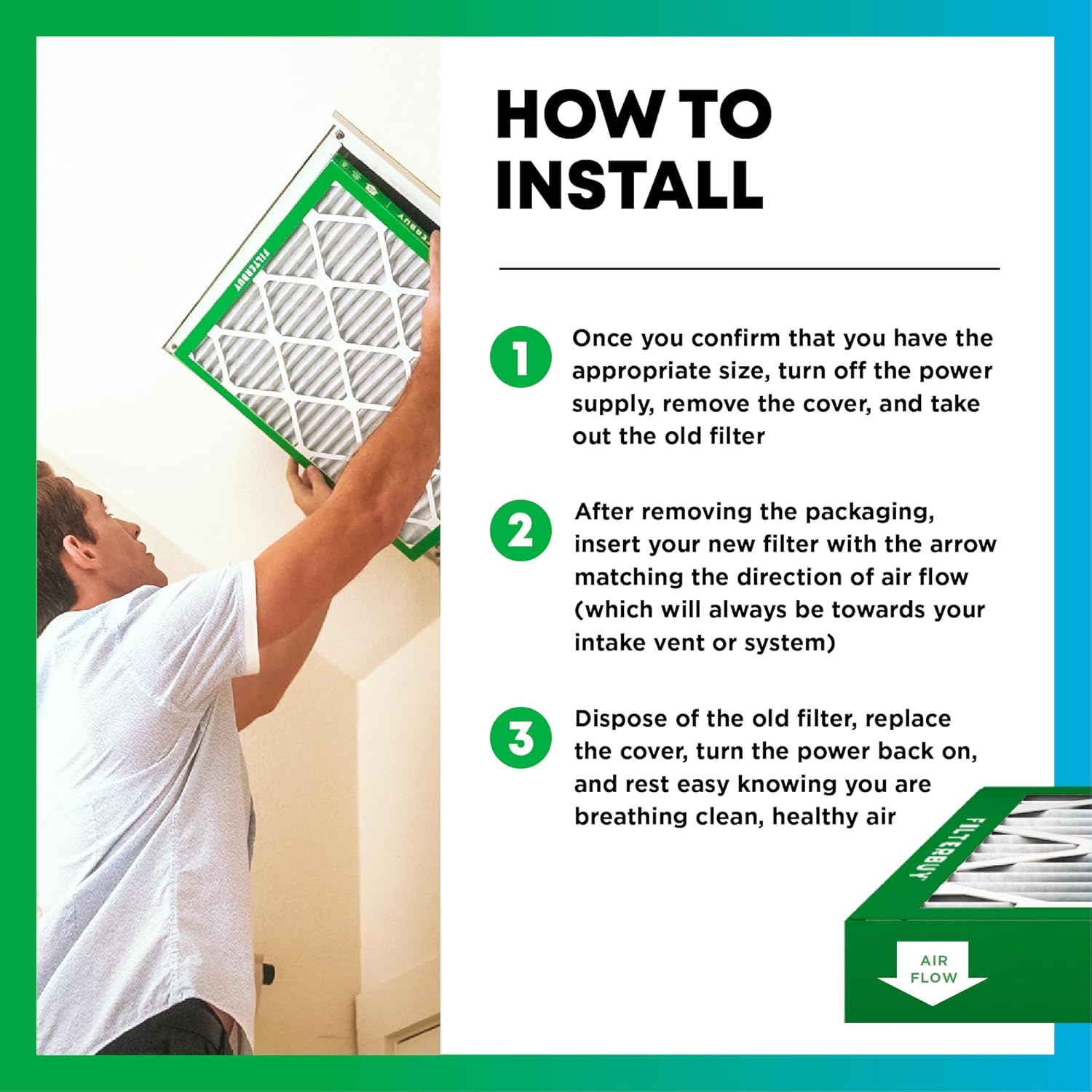 After finding the right size, turn off the power supply and remove the cover from your intake vent before taking out the old filter. Then just insert your new filter to match the direction of air flow, replace the cover, and turn the power back on.