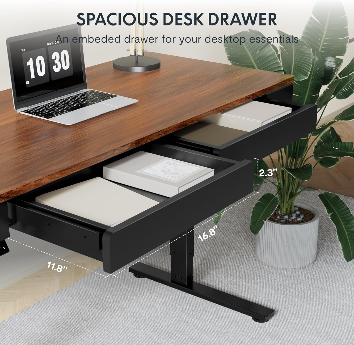 TWO SPACIOUS WOODEN DRAWERS: Our adjustable desk features two large 16.8"x11.8"x2.3" (inner space) drawers with smooth sliding rails, perfect for storing office supplies and keeping your workspace organized and comfortable.