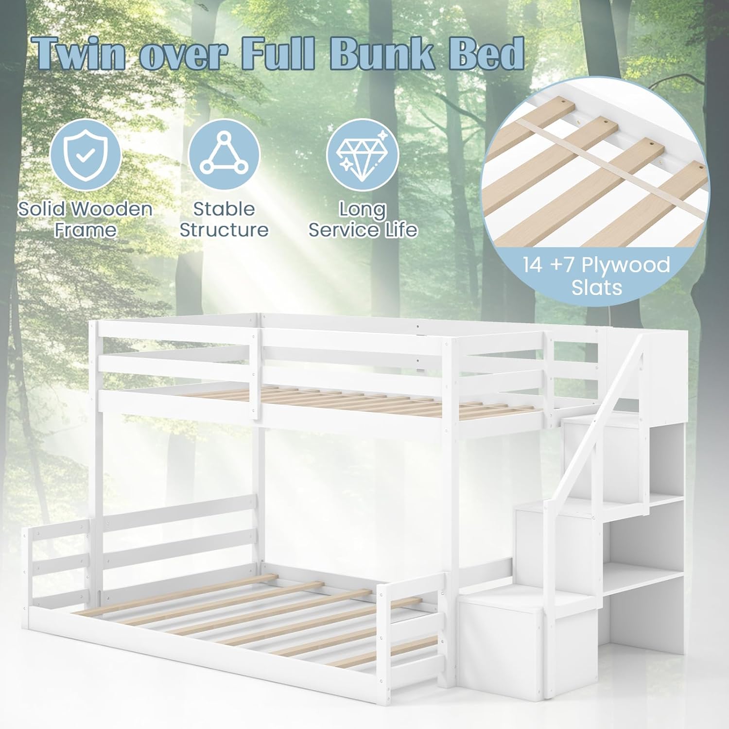 Robust Wooden Structure: Crafted from 14+7 sturdy plywood slats, this bunk bed offers reliable support for both mattresses, without the need for a box spring. Moreover, the solid wood material makes the bed able to accompany kids for years