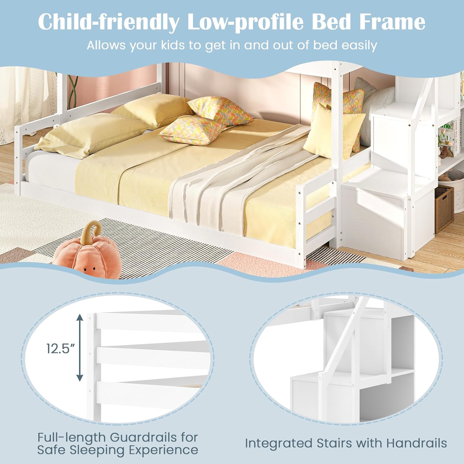 Enhanced Safety Features: The top bunk has full-length guardrails to ensure a safe sleep area, while the bottom bunk comes with headboard and footboard for added protection. Combined with the handrails, this twin bunk bed offers enhanced security