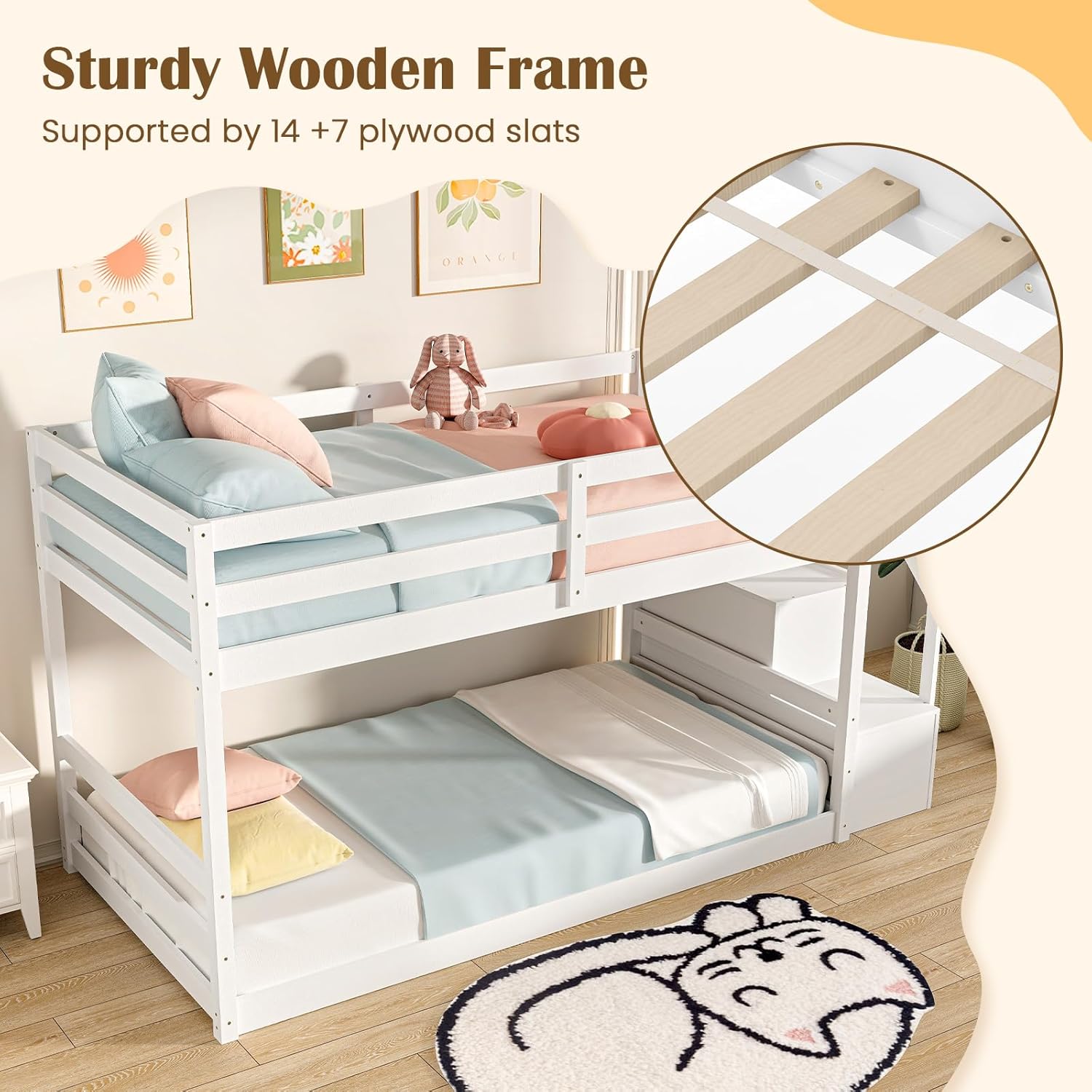 • Twin Over Twin Bunk Bed with Stairs, Solid Wood Floor Bunk Bed with Storage Staircase & Full-Length Guardrails, Low Bunk Bed with for Kids, Teens, Adults, Dorm, Small Space, White