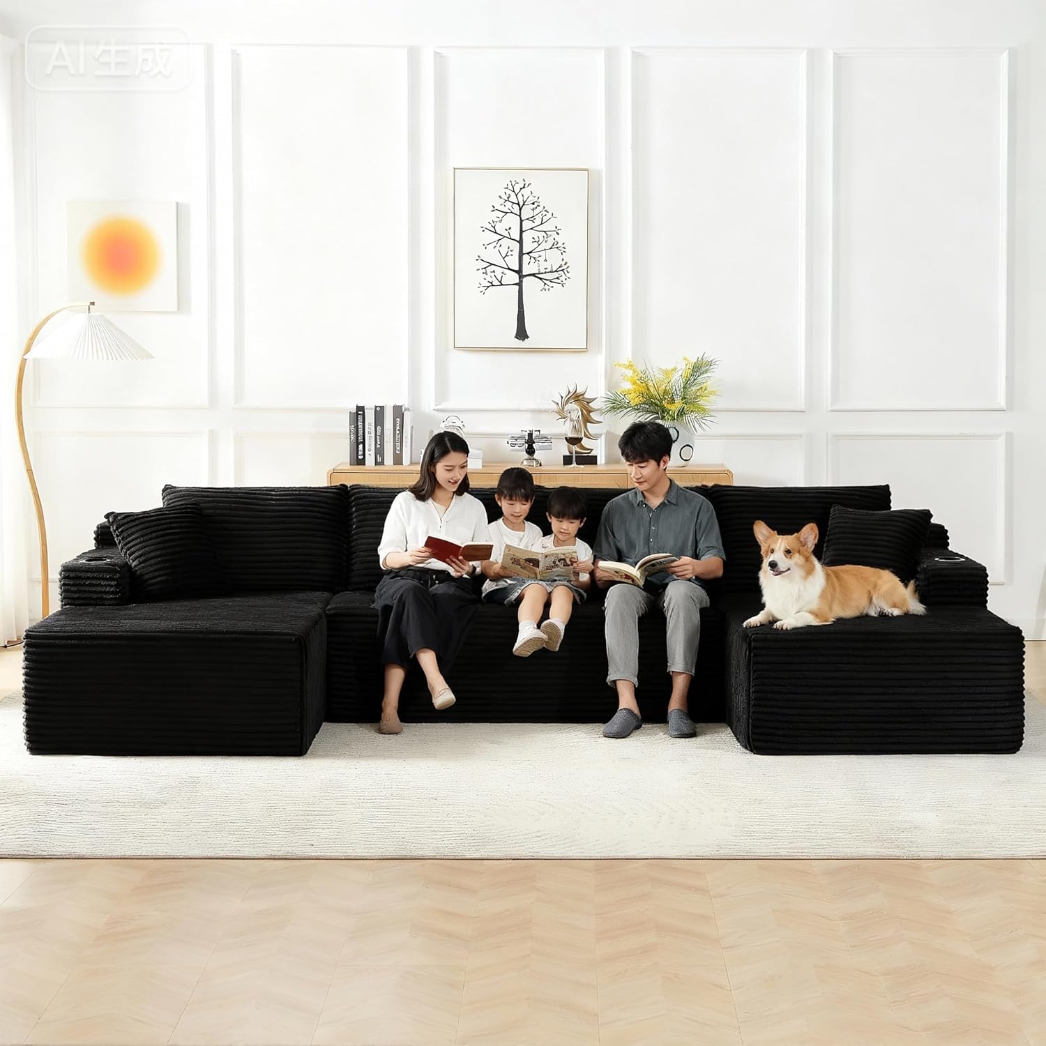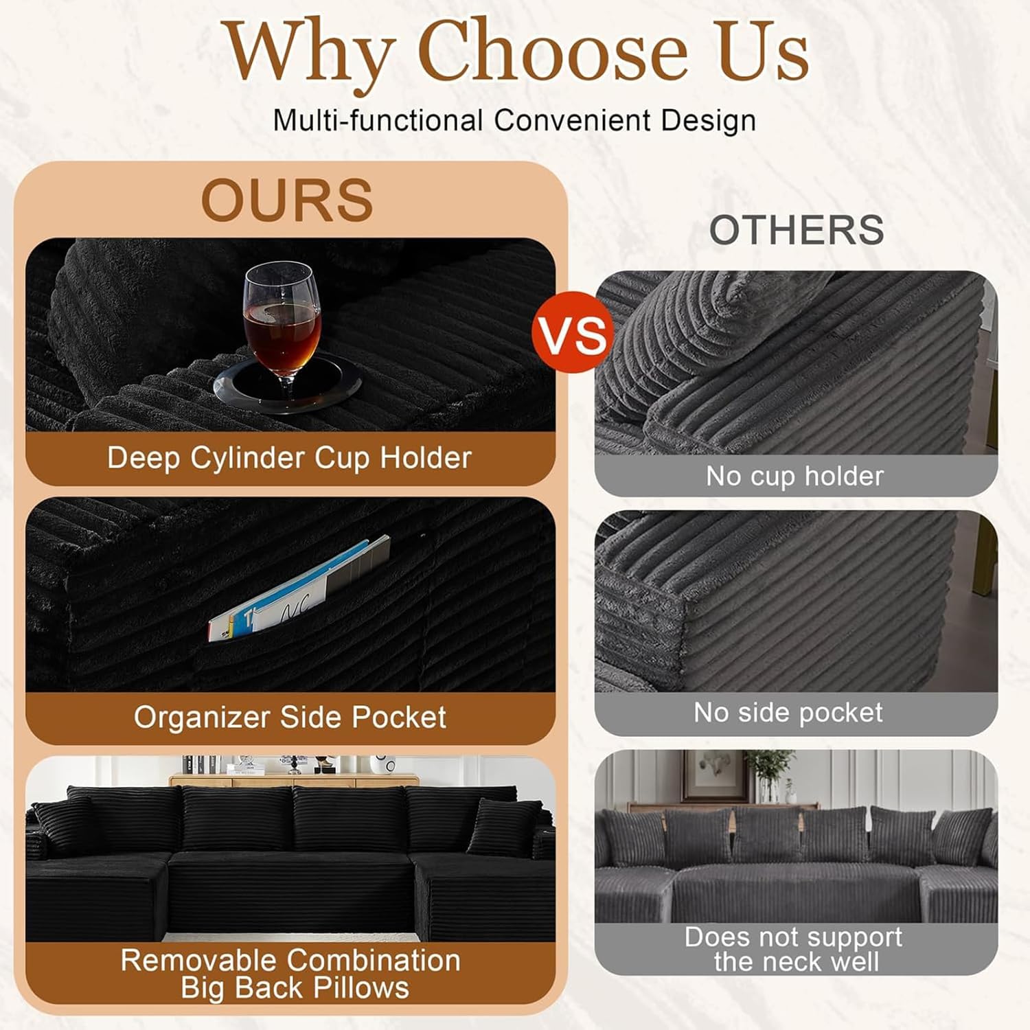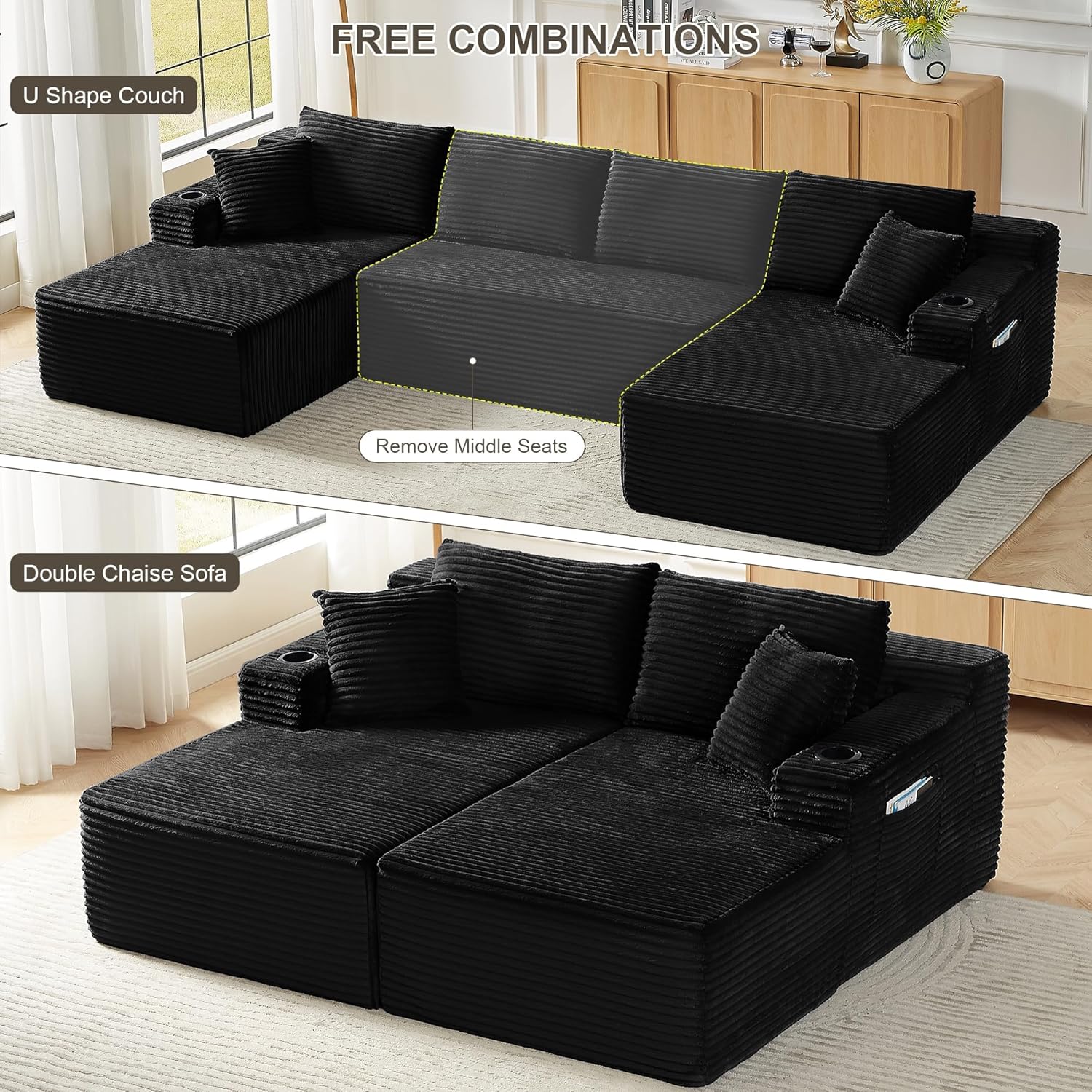 Thoughtful Details: Our fluffy corduroy couch sectional each armrest is equipped with a cup holder,soft armrest pad,and side pockets, adding more comfort and convenience to your daily life.