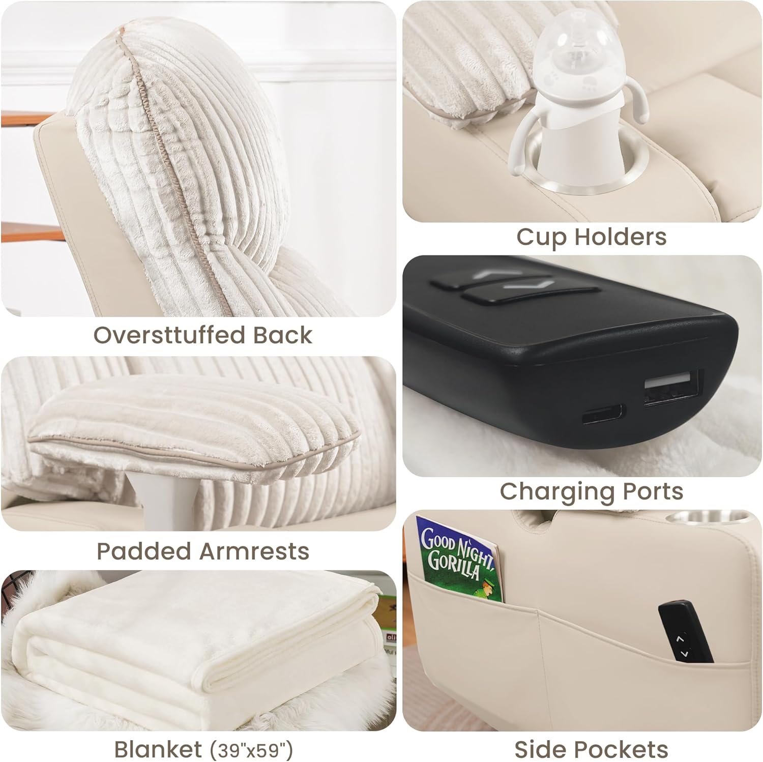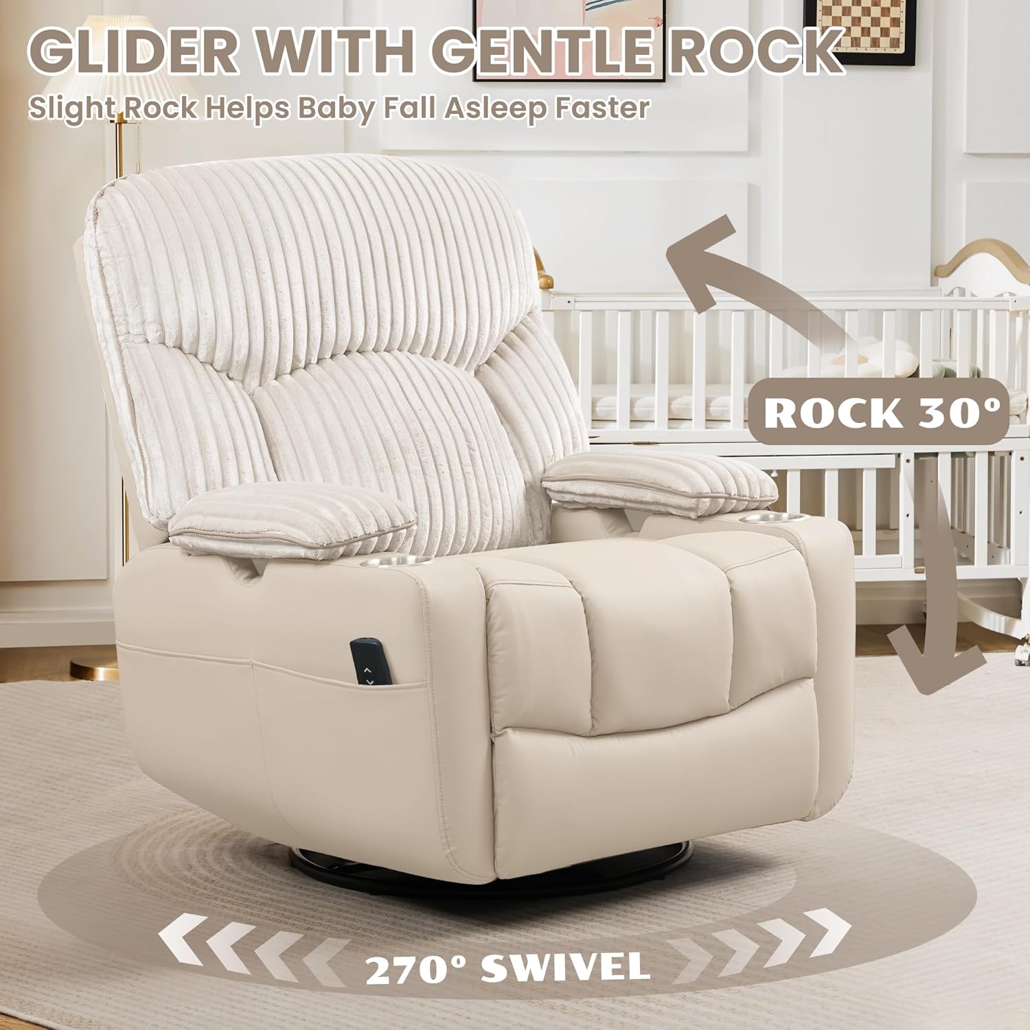[Multifunctional Nursery Glider Practical & Parent-Friendly] Designed for comfort and convenience, this glider features durable, easy-clean silicone leather that is waterproof and stain-resistant. The armrest includes dual cup holders, USB/Type-C charging ports, and side pockets for essentialsperfect for feeding, relaxing, or quiet moments in the nursery or living room.