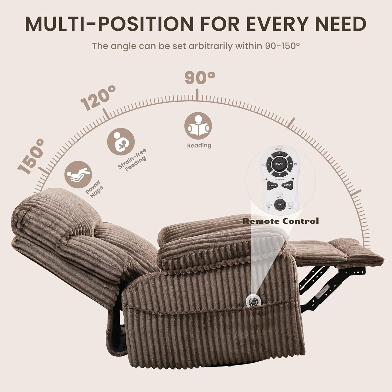 Infinite Power Recline : Smoothly achieve your ideal comfort angle with the electric recliner function, adjusting the backrest and footrest up to 150 and stopping at any infinite position for personalized support. Ideal for therapeutic needs, providing tailored support for nursing, post-surgery recovery, or deep relaxation after long workdays.