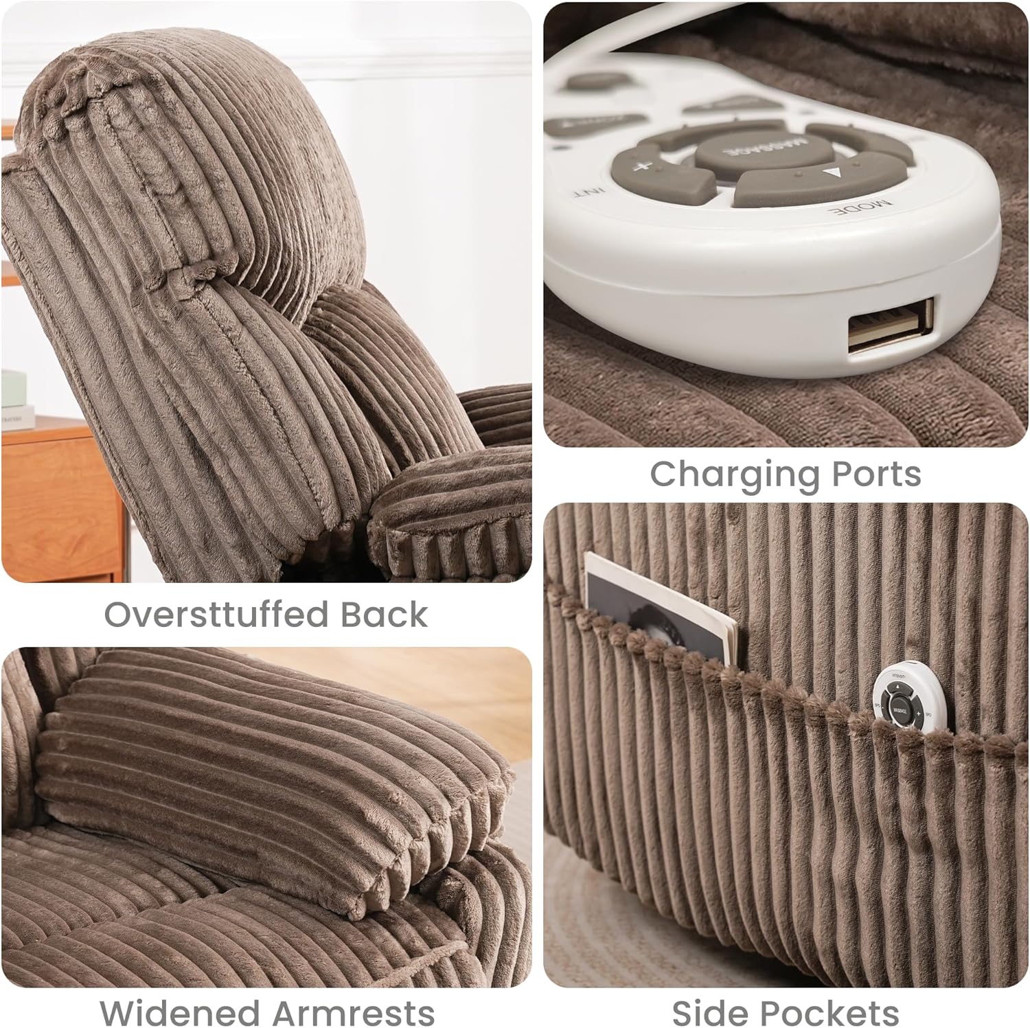 All-in-One Remote & USB Charging Hub : Control your entire comfort experiencerecline, 8-point vibration massage, and soothing heat therapyfrom one intuitive remote. Forget fumbling for wall sockets; the remote includes a convenient USB charging port to keep your mobile devices powered while you relax.