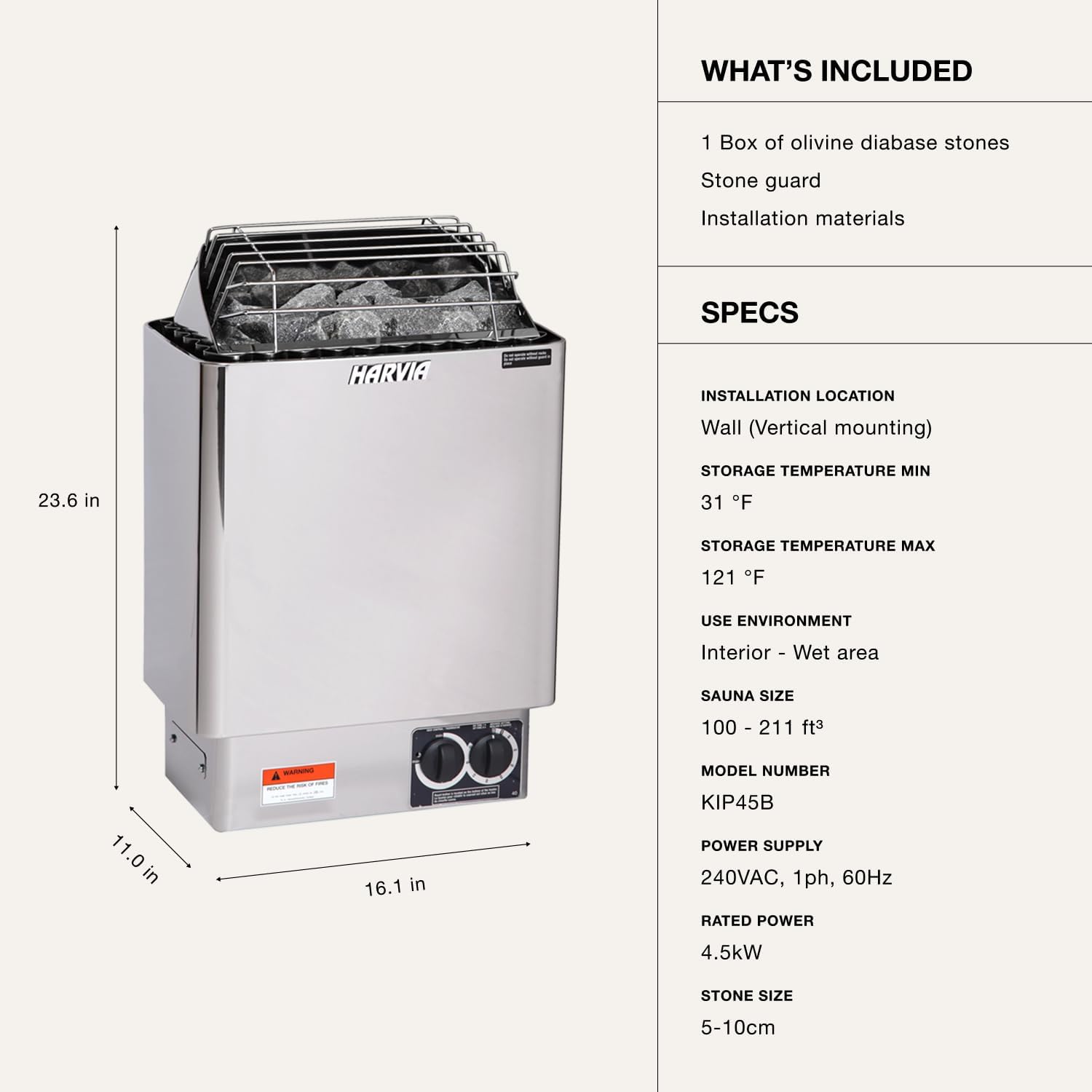 Durable, Dual-Wall Design: Built in premium stainless steel, the dual-wall design keeps the sauna heater cool the touch even while in use. The KIP includes a large stone cavity ensuring maximum heat release with efficient distribution.