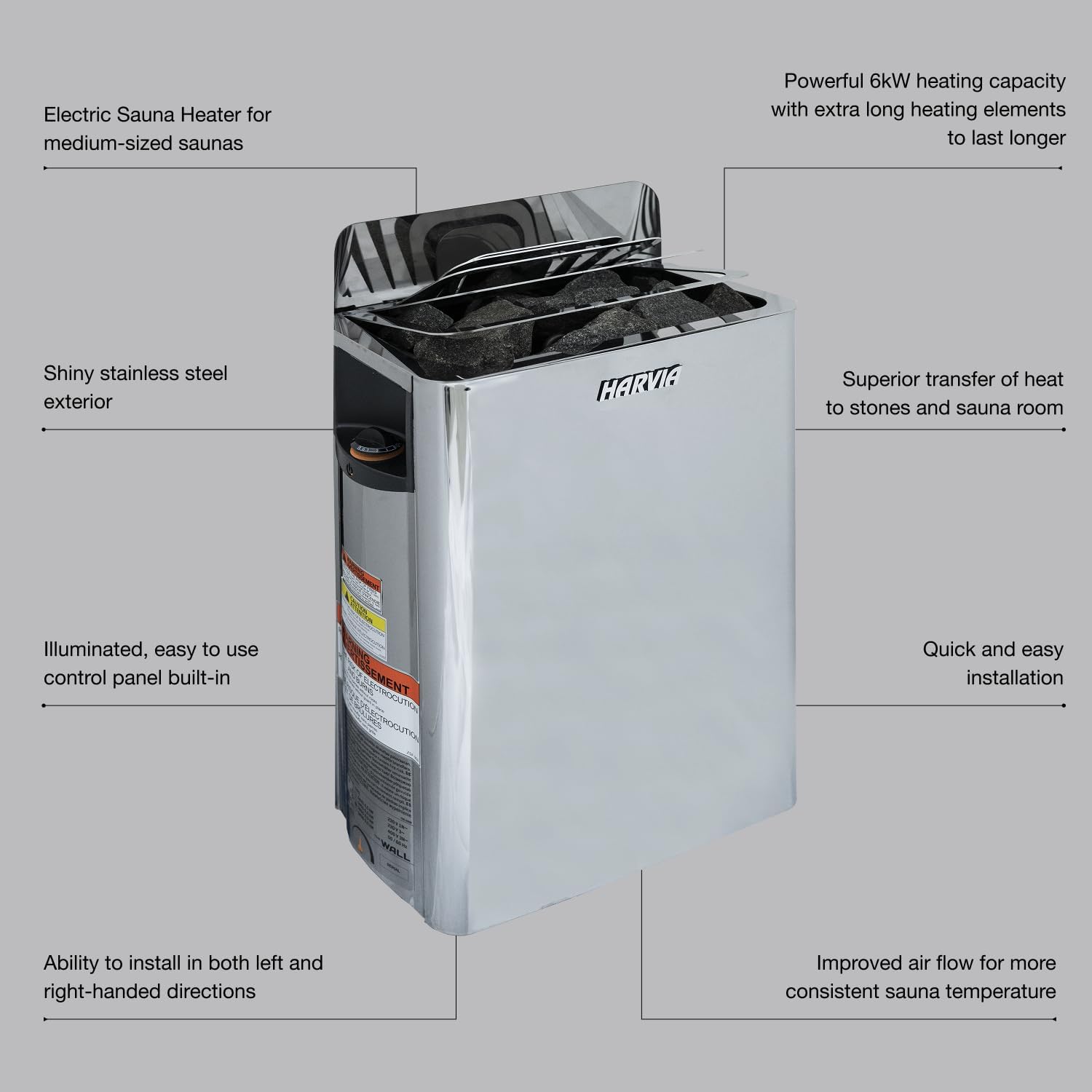 Easy-to-Use, Illuminated Control Panel: Seamlessly adjust your electric sauna heater's temperature an timer to start whenever you need it to be ready. The heater can be installed in both left and right handed directions, providing flexibility when designing a sauna interior.