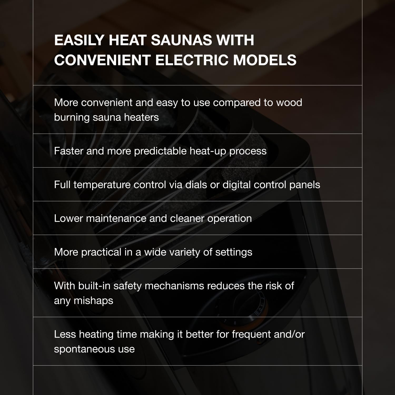 The Pioneers of Sauna Heaters: For 75 years, has been the industry leader in producing the finest variety of sauna heaters and stoves. In the early 2000s, became the world's leading manufacturer of sauna heaters, and continue to expand sauna innovation.